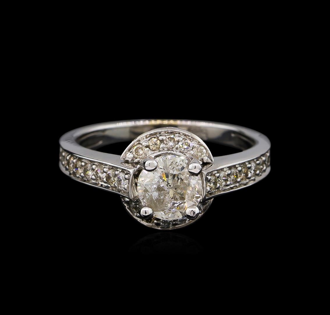 One electronically tested 14KT white gold lady's combination cast & assembled diamond engagement ring with a bright polish finish. Condition is new. Identified with markings of "585". Containing: One prong set round brilliant cut diamond, measuring 6.10 - 6.00 x 4.00mm (depth est.) approximate weight of 0.89ct. Clarity of I-3, color of I, cut is good. Twenty-eight bead set round brilliant cut diamonds, measuring 1.30 - 1.30 x 0.78mm (depth est.) approximate total weight of 28 Stones = 0.22ct. Clarity of I-1, color of I - K, cut is good. Total Weight of Diamonds: 1.12ct. Total Weight of Engagement Ring: 4.00 grams. GGL Appraised at $5,480.00.
