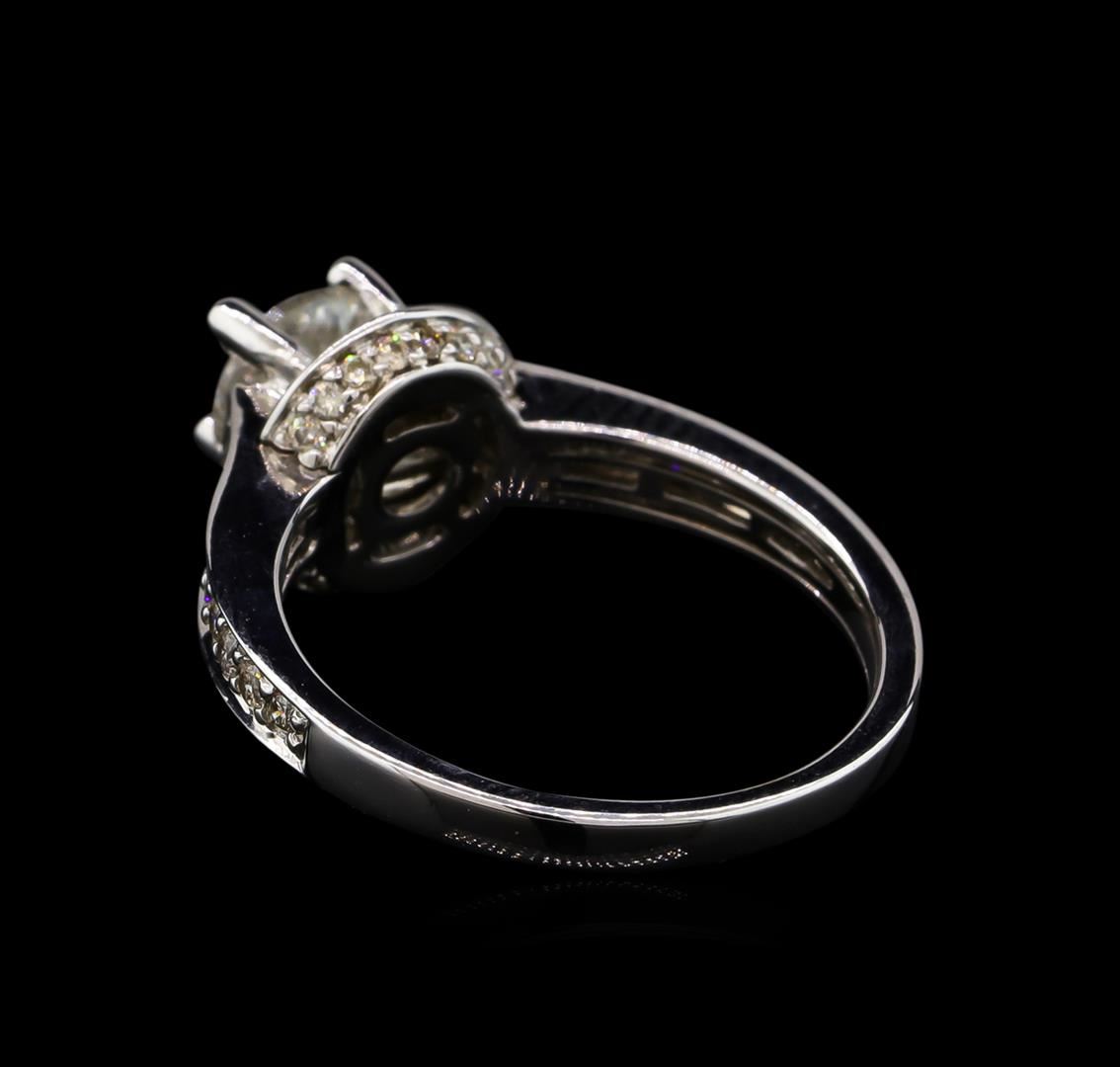 One electronically tested 14KT white gold lady's combination cast & assembled diamond engagement ring with a bright polish finish. Condition is new. Identified with markings of "585". Containing: One prong set round brilliant cut diamond, measuring 6.10 - 6.00 x 4.00mm (depth est.) approximate weight of 0.89ct. Clarity of I-3, color of I, cut is good. Twenty-eight bead set round brilliant cut diamonds, measuring 1.30 - 1.30 x 0.78mm (depth est.) approximate total weight of 28 Stones = 0.22ct. Clarity of I-1, color of I - K, cut is good. Total Weight of Diamonds: 1.12ct. Total Weight of Engagement Ring: 4.00 grams. GGL Appraised.