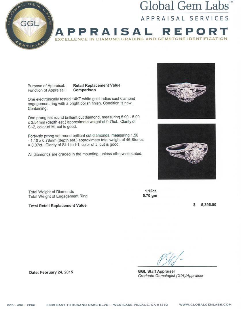 One electronically tested 14KT white gold ladies cast diamond engagement ring with a bright polish finish. Condition is new. Containing: One prong set round brilliant cut diamond, measuring 5.90 - 5.90 x 3.54mm (depth est.) approximate weight of 0.75ct. Clarity: SI-2. Color: M, Cut is Good. Forty-Six prong set round brilliant cut diamonds, measuring 1.50 - 1.10 x 0.78mm (depth est.) approximate total weight of 46 Stones = 0.37ct. Clarity: SI-1 to I-1. Color: J, Cut is Good. All diamonds are graded in the mounting, unless otherwise stated. Total Weight of Diamonds 1.12ct. Total Weight of Engagement Ring 5.70 grams. GGL Appraised at $5,395.00.