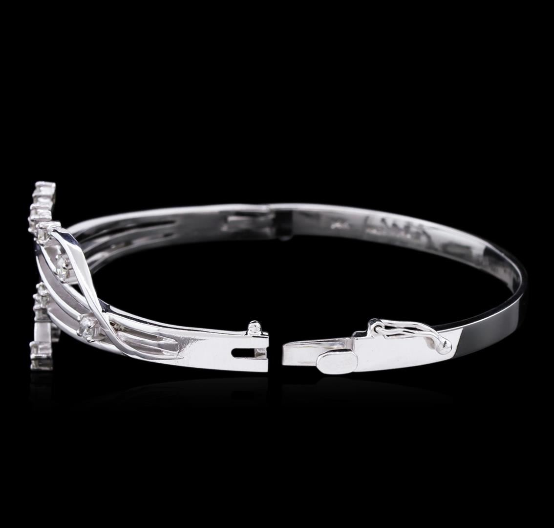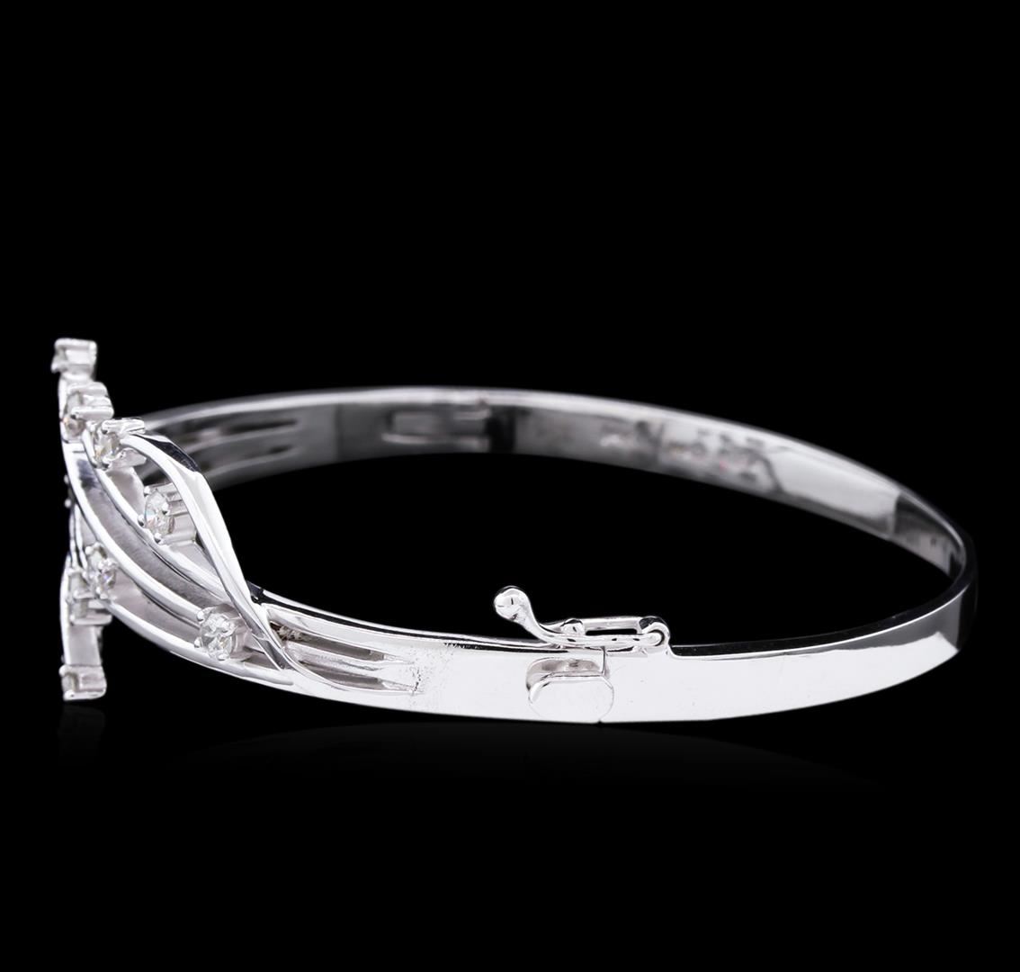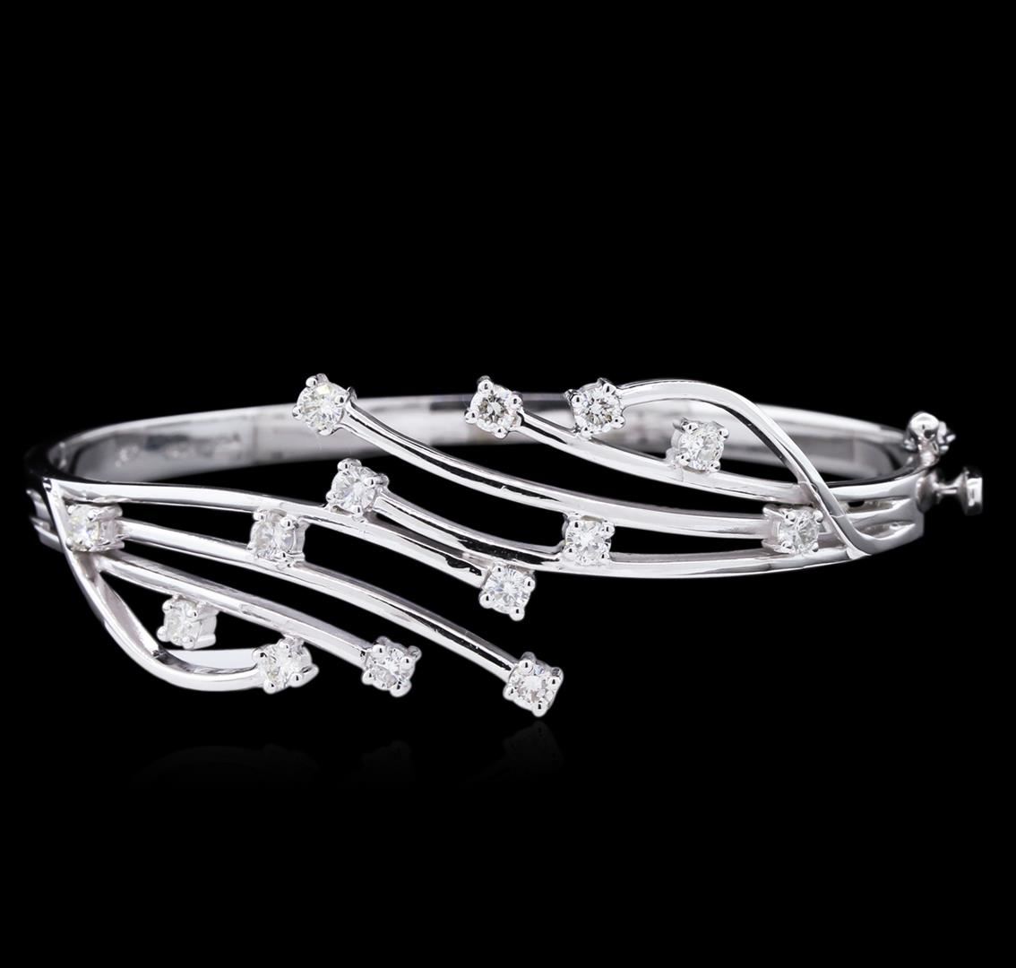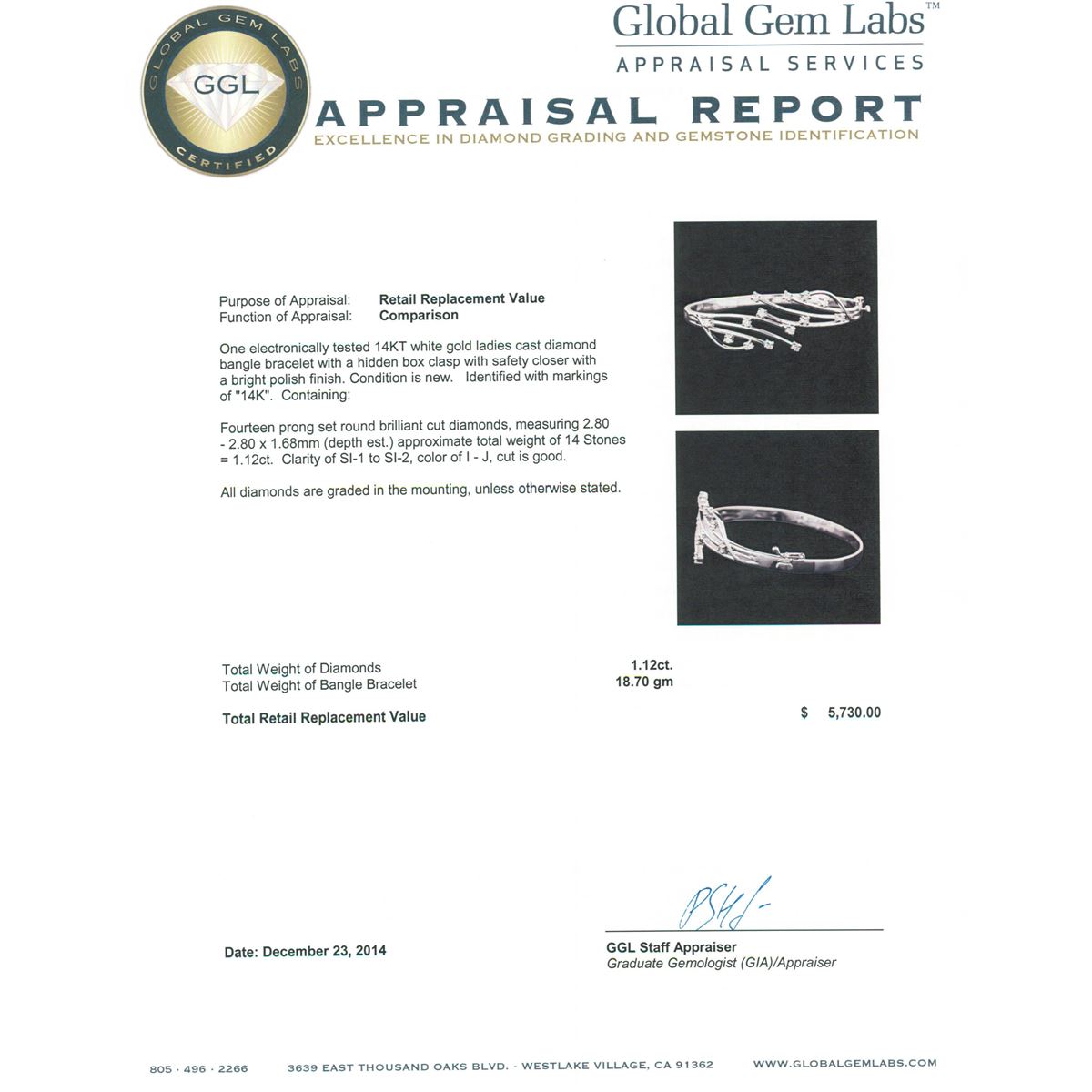 One electronically tested 14KT white gold ladies cast diamond bangle bracelet with a hidden box clasp with safety closer with a bright polish finish. Identified with markings of "14K". Condition is new. Containing: Fourteen prong set round brilliant cut diamonds, measuring 2.80 - 2.80 x 1.68mm (depth est.) approximate total weight of 14 Stones = 1.12ct. Clarity: SI-1 to SI-2. Color: I - J, Cut is Good. All diamonds are graded in the mounting, unless otherwise stated. Total Weight of Diamonds 1.12ct. Total Weight of Bangle Bracelet 18.70 grams. GGL Appraised at $5,730.00.