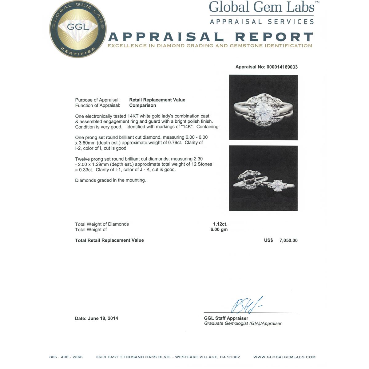One electronically tested 14KT white gold Ladies combination cast & assembled engagement ring and guard with a bright polish finish. Condition is very good. Identified with markings of "14K". Containing: One prong set round brilliant cut diamond, measuring 6.00 - 6.00 x 3.60mm (depth est.)approximate weight of 0.79ct. Clarity of I-2, color of I, cut is good. Twelve prong set round brilliant cut diamonds, measuring 2.30 - 2.00 x 1.29mm (depth est.)approximate total weight of 12 Stones = 0.33ct. Clarity of I-1, color of J - K, cut is good. Diamonds graded in the mounting. Total Weight of Diamonds 1.12ct. Total Weight of 6.00 grams. GGL Appraised at $7,050.00.