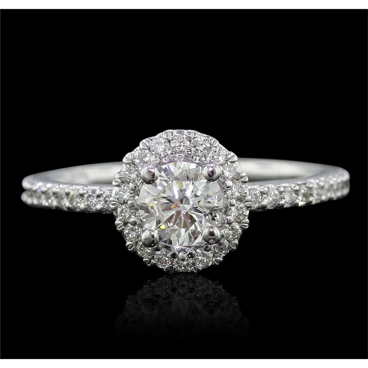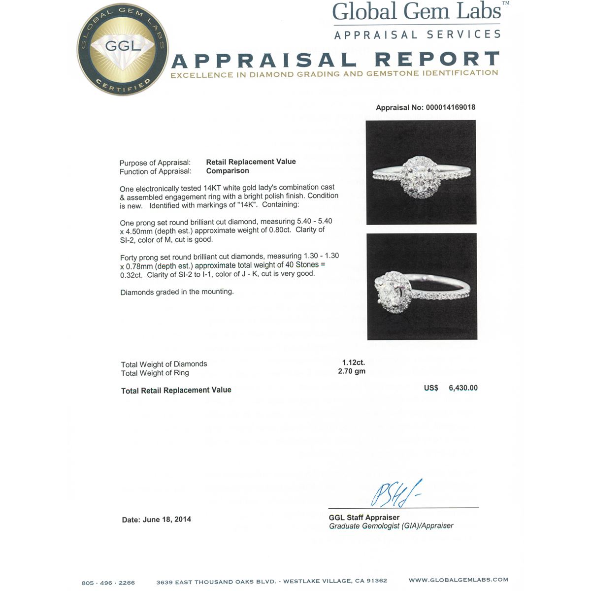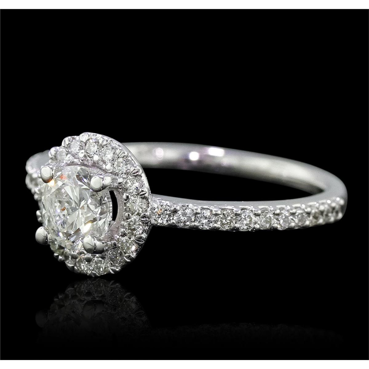 One electronically tested 14KT white gold Ladies combination cast & assembled engagement ring with a bright polish finish. Condition is new. Identified with markings of "14K". Containing: One prong set round brilliant cut diamond, measuring 5.40 - 5.40 x 4.50mm (depth est.) approximate weight of 0.80ct. Clarity: SI-2. Color: M, Cut is Good. Forty prong set round brilliant cut diamonds, measuring 1.30 - 1.30 x 0.78mm (depth est.) approximate. Total Weight of 40 Stones = 0.32ct. Clarity: SI-2 to I-1. Color: J - K, Cut is Very Good. Diamonds graded in the mounting. Total Weight of Diamonds 1.12ct. Total Weight of Ring 2.70 grams. GGL Appraised at $6,430.00.