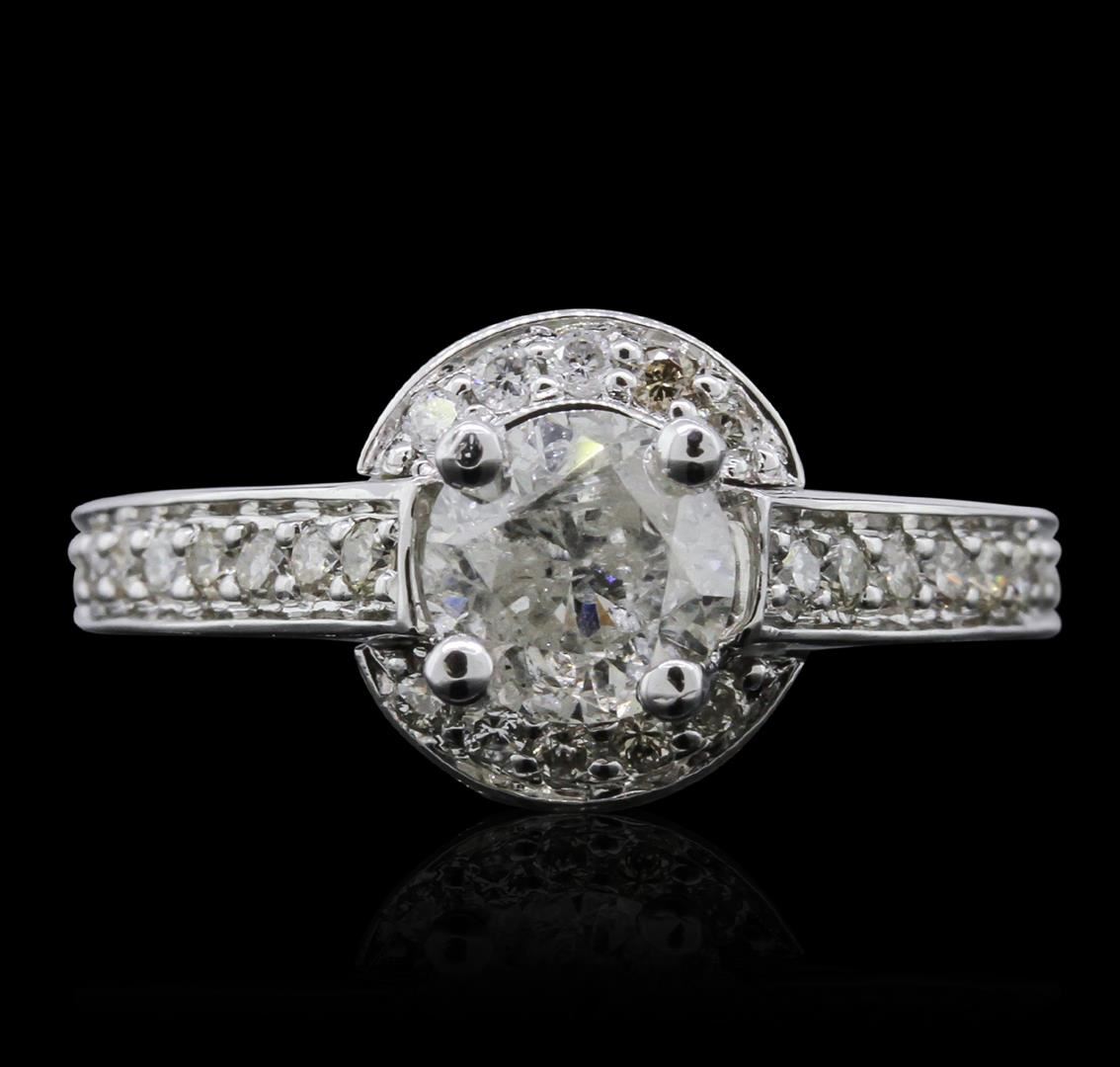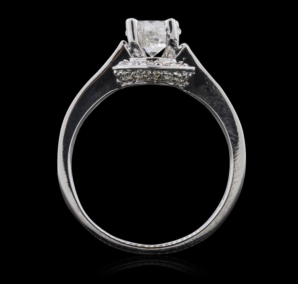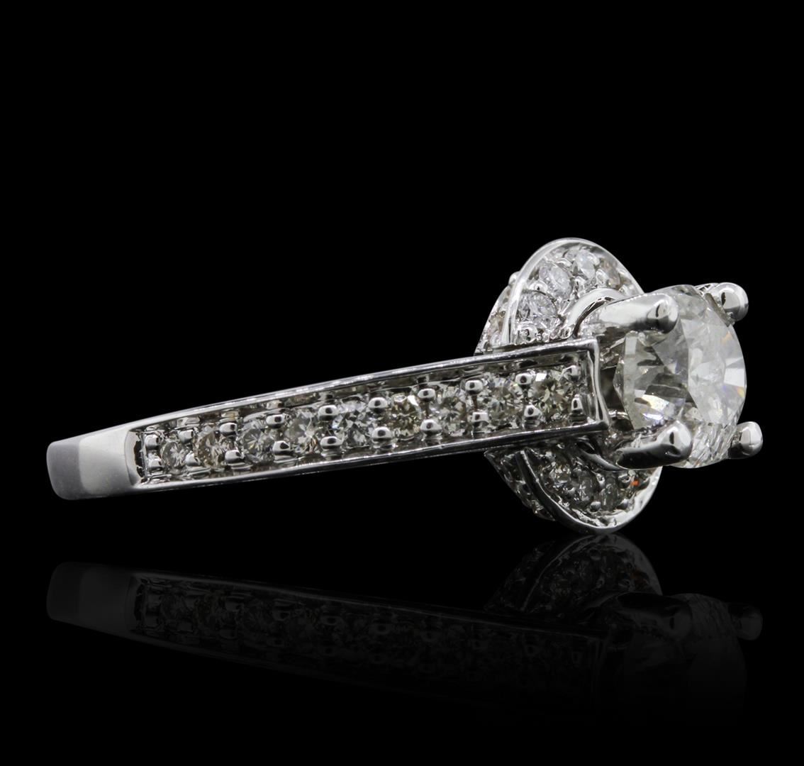 One electronically tested 14KT white gold lady's combination cast & assembled diamond engagement ring with a bright polish finish. Condition is new. Identified with markings of "585". Containing: One prong set round brilliant cut diamond, measuring 6.10 - 6.00 x 4.00mm (depth est.) approximate weight of 0.89ct. Clarity of I-3, color of I, cut is good. Twenty-eight bead set round brilliant cut diamonds, measuring 1.30 - 1.30 x 0.78mm (depth est.) approximate total weight of 28 Stones = 0.22ct. Clarity of I-1, color of I - K, cut is good. Total Weight of Diamonds: 1.12ct. Total Weight of Engagement Ring: 4.00 grams. GGL Appraised at $5,480.00.