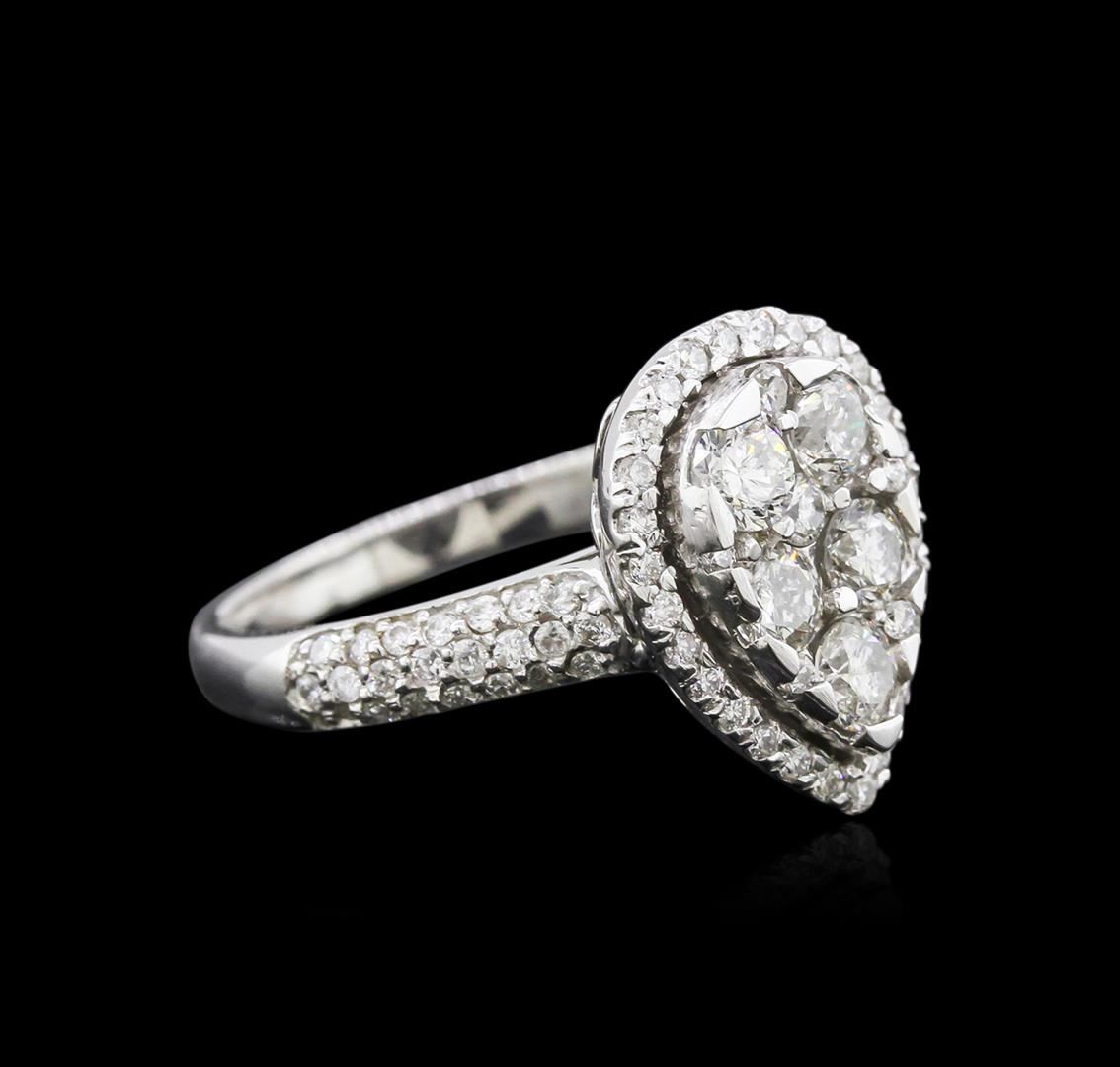 One electronically tested 14KT white gold ladies cast diamond ring with a bright polish finish. Identified with markings of "K14". Condition is new. Containing: Seventy-Eight prong set round brilliant cut diamonds, measuring 1.10 - 1.10 x 0.66mm (depth est.) approximate total weight of 78 Stones = 0.45ct. Clarity: I-1 to I-2. Color: I - J, Cut is Good. Six prong set round brilliant cut diamonds, measuring 3.00 - 3.00 x 1.80mm (depth est.) approximate total weight of 6 Stones = 0.68ct. Clarity: SI-2 to I-1. Color: H - I, Cut is Good. Diamonds are graded in the mounting, unless otherwise stated. Total Weight of Diamonds 1.13ct. Total Weight of Ring 5.30 grams. GGL Appraised at $3,640.00.