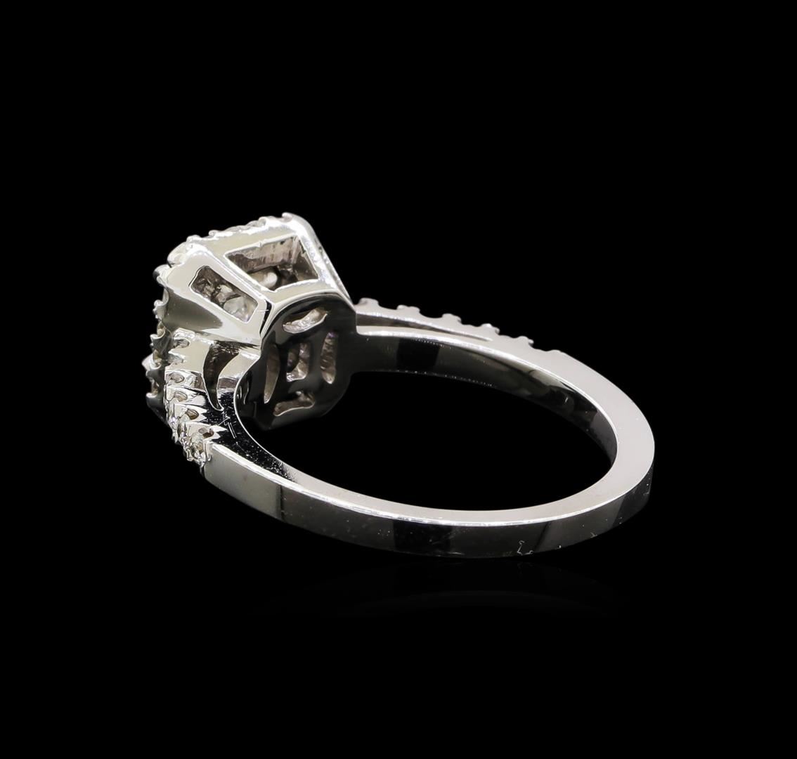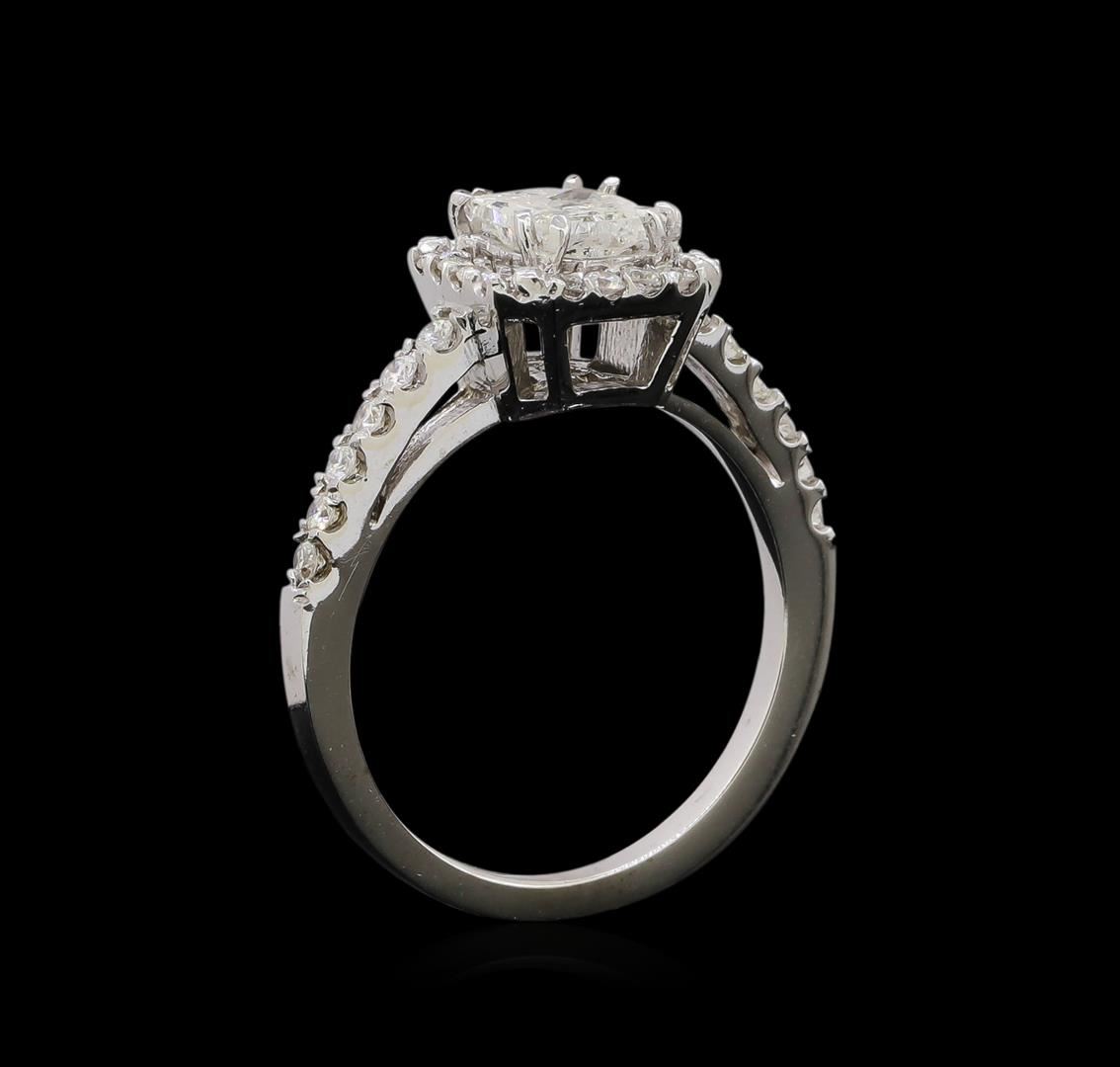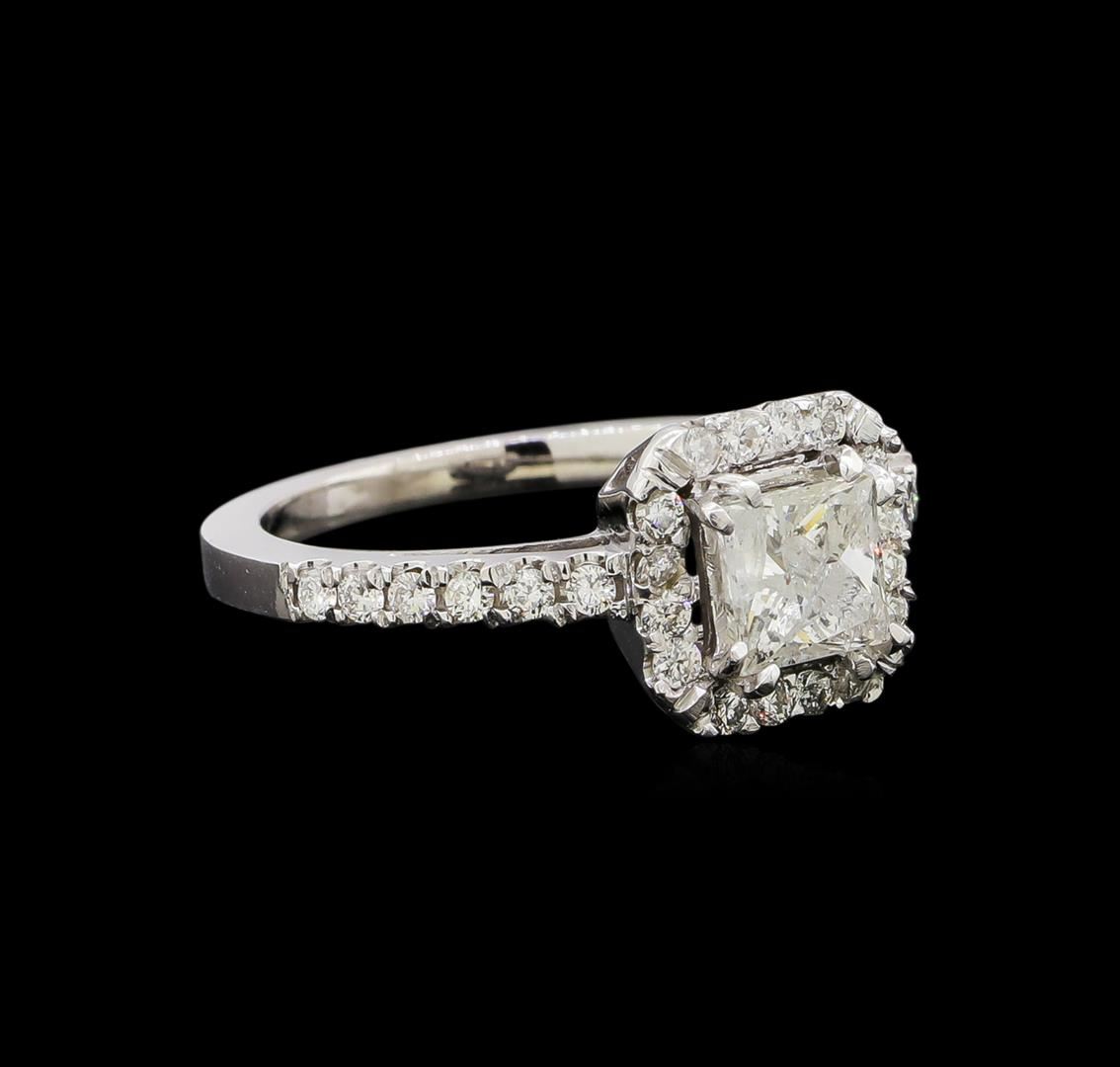 One electronically tested 14KT white gold ladies cast diamond engagement ring. Identified with markings of "14K". Condition is new. Containing: One prong set princess cut diamond, measuring 5.20 x 5.20 x 3.90mm (depth est.) approximate weight of 0.70ct. Clarity: I-2. Color: J, Cut is Good. Thirty-Two prong set round brilliant cut diamonds, measuring 1.50 - 1.50 x 0.90mm (depth est.) approximate total weight of 32 Stones = 0.43ct. Clarity: SI-2 to I-2. Color: I - J, Cut is Good. Diamonds are graded in the mounting, unless otherwise stated. Total Weight of Diamonds 1.13ct. Total Weight of Engagement Ring 4.00 grams. GGL Appraised at $3,015.00.