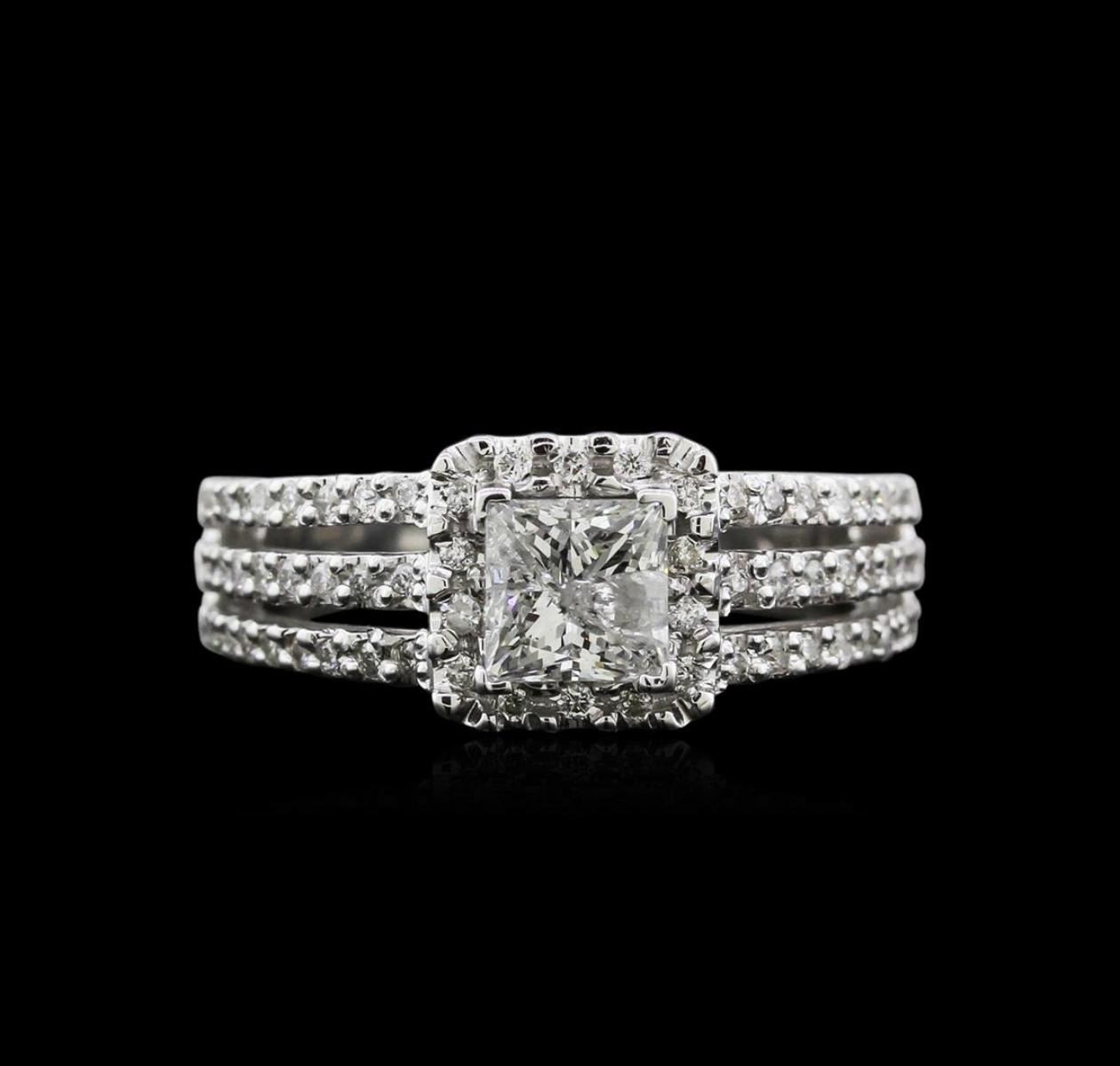 One electronically tested 14KT white gold ladies cast diamond ring with a bright polish finish. Identified with markings of "14K". Condition is new. Containing: One prong set princess cut diamond, measuring 4.80 x 4.80 x 3.60mm (depth est.) approximate weight of 0.78ct. Clarity: I-2. Color: H, Cut is Good. Seventy-One prong set round brilliant cut diamonds, measuring 1.10 - 1.10 x 0.66mm (depth est.) approximate total weight of 71 Stones = 0.35ct. Clarity: I-1 to I-2. Color: H - I, Cut is Good. Diamonds are graded in the mounting, unless otherwise stated. Total Weight of Diamonds 0.78ct. Total Weight of Ring 5.70 grams. GGL Appraised.