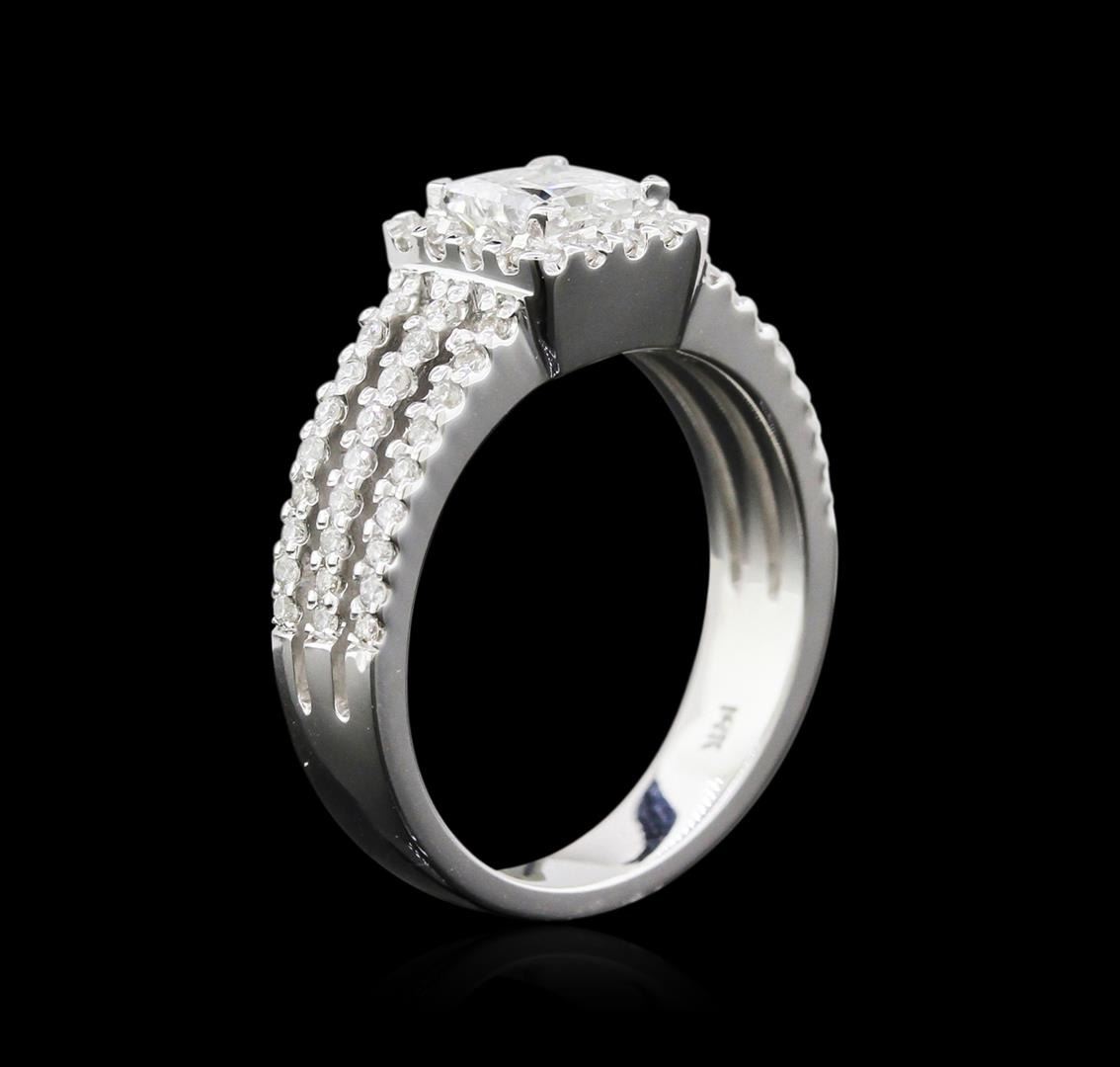 One electronically tested 14KT white gold ladies cast diamond ring with a bright polish finish. Identified with markings of "14K". Condition is new. Containing: One prong set princess cut diamond, measuring 4.80 x 4.80 x 3.60mm (depth est.) approximate weight of 0.78ct. Clarity: I-2. Color: H, Cut is Good. Seventy-One prong set round brilliant cut diamonds, measuring 1.10 - 1.10 x 0.66mm (depth est.) approximate total weight of 71 Stones = 0.35ct. Clarity: I-1 to I-2. Color: H - I, Cut is Good. Diamonds are graded in the mounting, unless otherwise stated. Total Weight of Diamonds 0.78ct. Total Weight of Ring 5.70 grams. GGL Appraised.