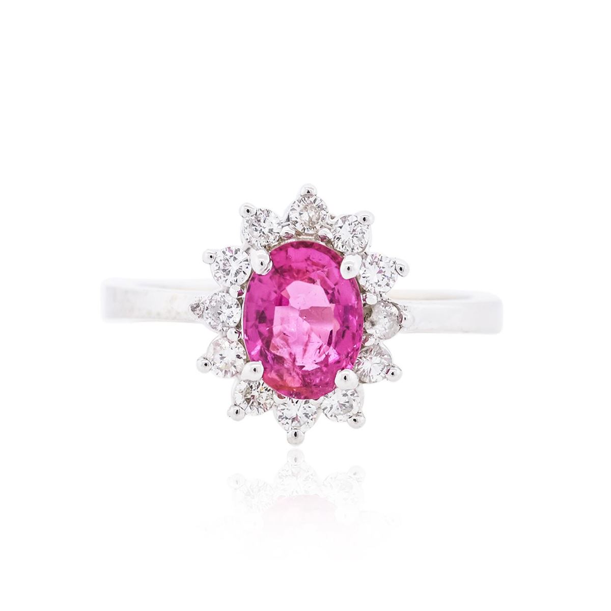 One electronically tested 14KT white gold ladies cast pink tourmaline and diamond ring with a bright polish finish. The featured pink tourmaline is set within a diamond bezel, completed by a two and one-half millimeter wide band. Identified with markings of "14K". Condition is new, good workmanship. Containing: One prong set oval mixed cut natural pink tourmaline, measuring 7.65 x 5.75 x 4.10mm, approximate weight of 1.13ct., clarity is slightly included, dark, moderately strong, pink color, (GIA Pk 7/4), cut is good. Transmitting light with a minimum of distortion, transparent. Naturally occurring internal & external characteristics are present. Graded in the setting. This color of tourmaline is commonly irradiated to improve or change the color. Whether or not this gemstone has been irradiated cannot currently be determined. Twelve prong set round brilliant cut diamonds, measuring 2.00 - 2.00 x 1.20mm (depth est.) approximate total weight of 12 Stones = 0.45ct. Graded in the setting. Clarity SI-1 to I-1. Color G - I. Total Weight of Colored Stones 1.13ct. Total Weight of Diamonds 0.45ct. Total Weight of Ring 3.89 grams. AIG Appraised at $2,255.00.