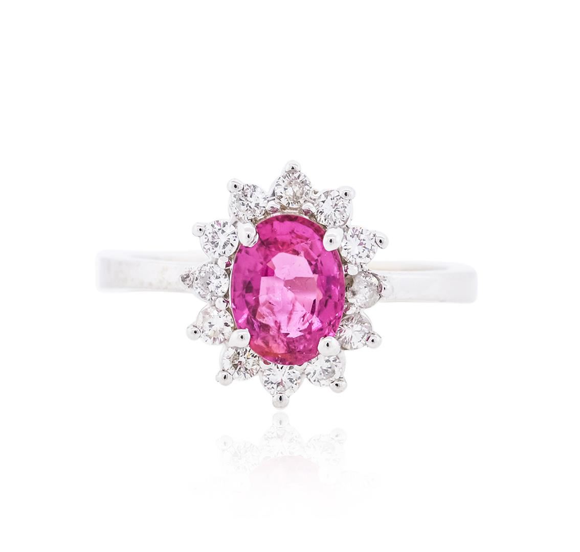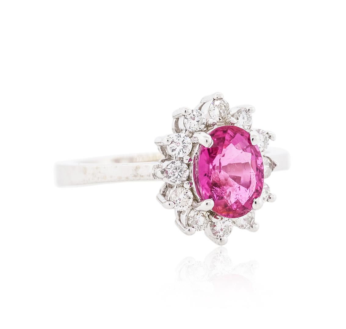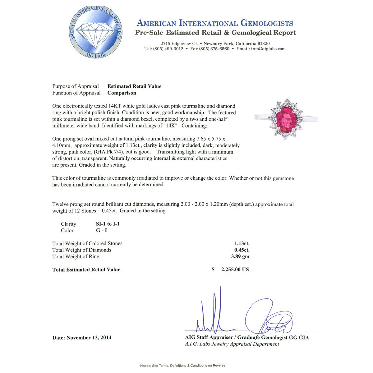 One electronically tested 14KT white gold ladies cast pink tourmaline and diamond ring with a bright polish finish. The featured pink tourmaline is set within a diamond bezel, completed by a two and one-half millimeter wide band. Identified with markings of "14K". Condition is new, good workmanship. Containing: One prong set oval mixed cut natural pink tourmaline, measuring 7.65 x 5.75 x 4.10mm, approximate weight of 1.13ct., clarity is slightly included, dark, moderately strong, pink color, (GIA Pk 7/4), cut is good. Transmitting light with a minimum of distortion, transparent. Naturally occurring internal & external characteristics are present. Graded in the setting. This color of tourmaline is commonly irradiated to improve or change the color. Whether or not this gemstone has been irradiated cannot currently be determined. Twelve prong set round brilliant cut diamonds, measuring 2.00 - 2.00 x 1.20mm (depth est.) approximate total weight of 12 Stones = 0.45ct. Graded in the setting. Clarity SI-1 to I-1. Color G -- I. Total Weight of Colored Stones 1.13ct. Total Weight of Diamonds 0.45ct. Total Weight of Ring 3.89 grams. AIG Appraised at $2,255.00.