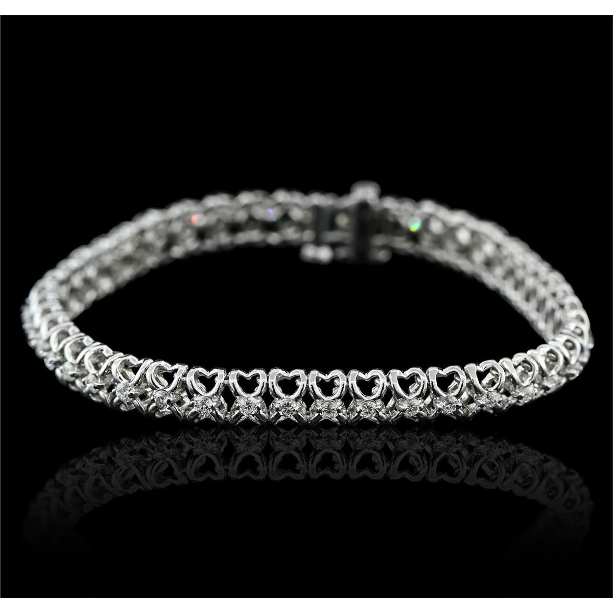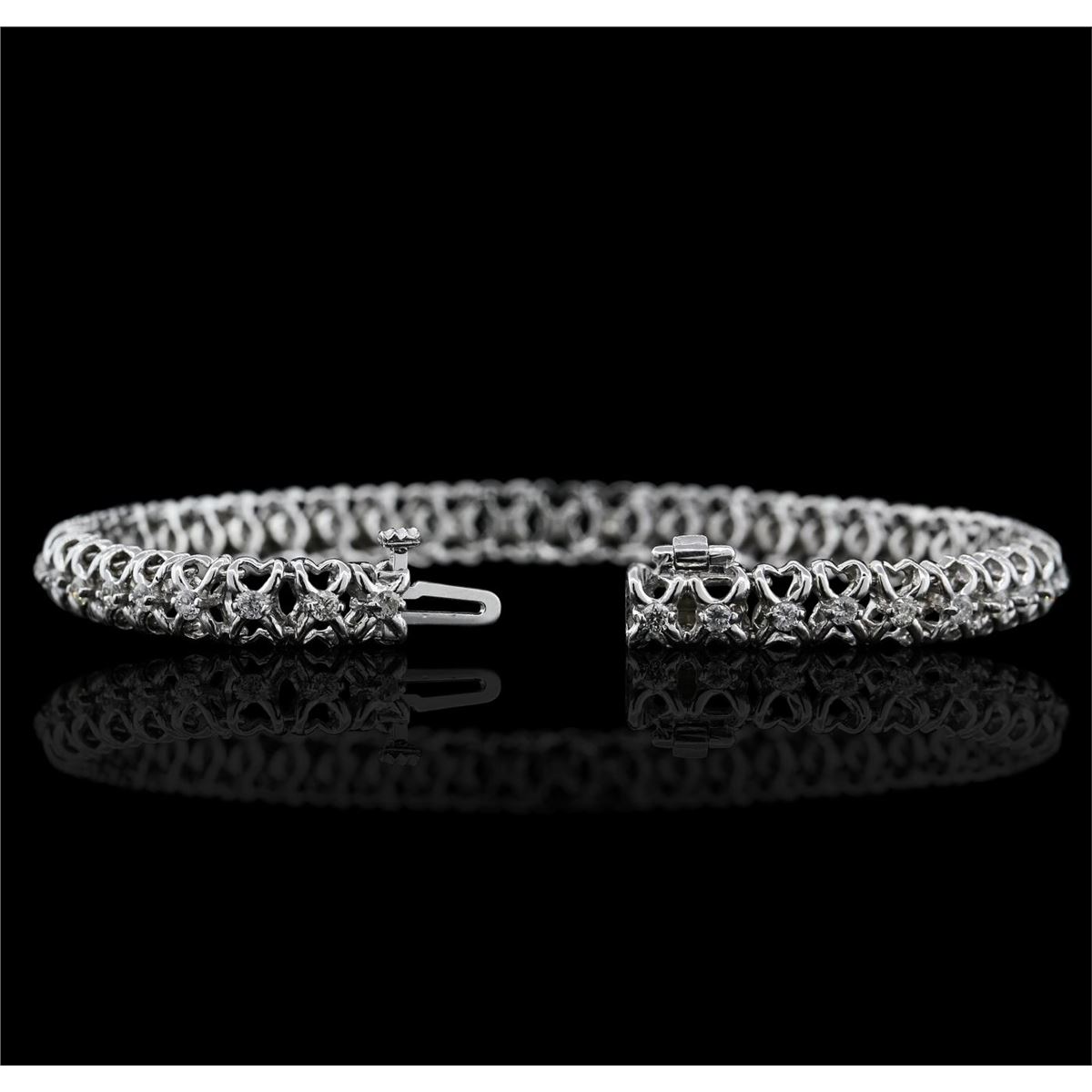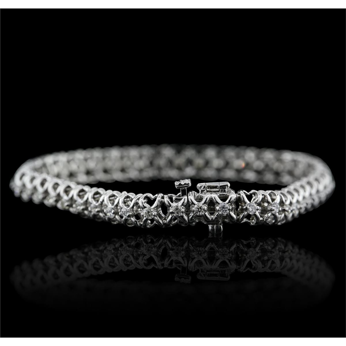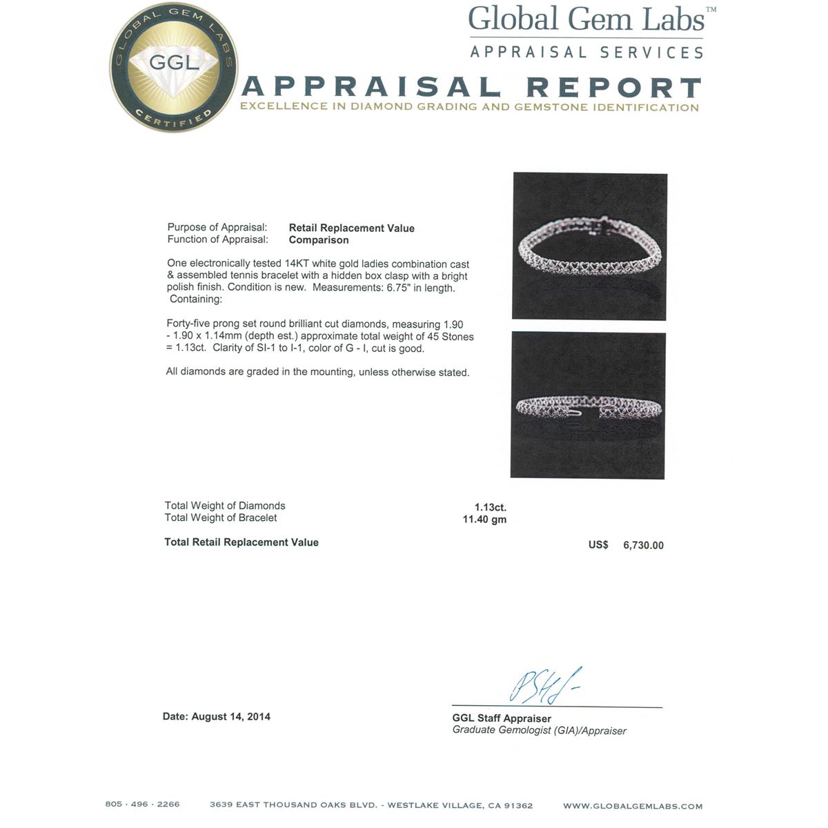 One electronically tested 14KT white gold ladies combination cast & assembled tennis bracelet with a hidden box clasp with a bright polish finish. Condition is new. Measurements: 6.75" in length. Containing: Forty-Five prong set round brilliant cut diamonds, measuring 1.90 - 1.90 x 1.14mm (depth est.) approximate total weight of 45 Stones = 1.13ct. Clarity: SI-1 to I-1. Color: G - I, Cut is Good. All diamonds are graded in the mounting, unless otherwise stated. Total Weight of Diamonds 1.13ct. Total Weight of Bracelet 11.40 grams. GGL Appraised at $6,730.00.