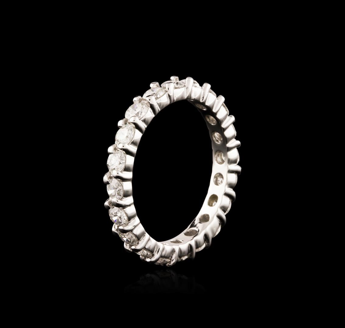 One electronically tested 14KT white gold ladies cast diamond eternity ring with a bright polish finish. Identified with markings of "14K". Condition is new. Containing: Twenty prong set round brilliant cut diamonds, measuring 2.50 - 2.50 x 1.50mm (depth est.) approximate total weight of 20 Stones = 1.14ct. Clarity: SI-1 to I-1. Color: I - J, Cut is Good. All diamonds are graded in the mounting, unless otherwise stated. Total Weight of Diamonds 1.14ct. Total Weight of Eternity Ring 2.70 grams. GGL Appraised at $3,050.00.