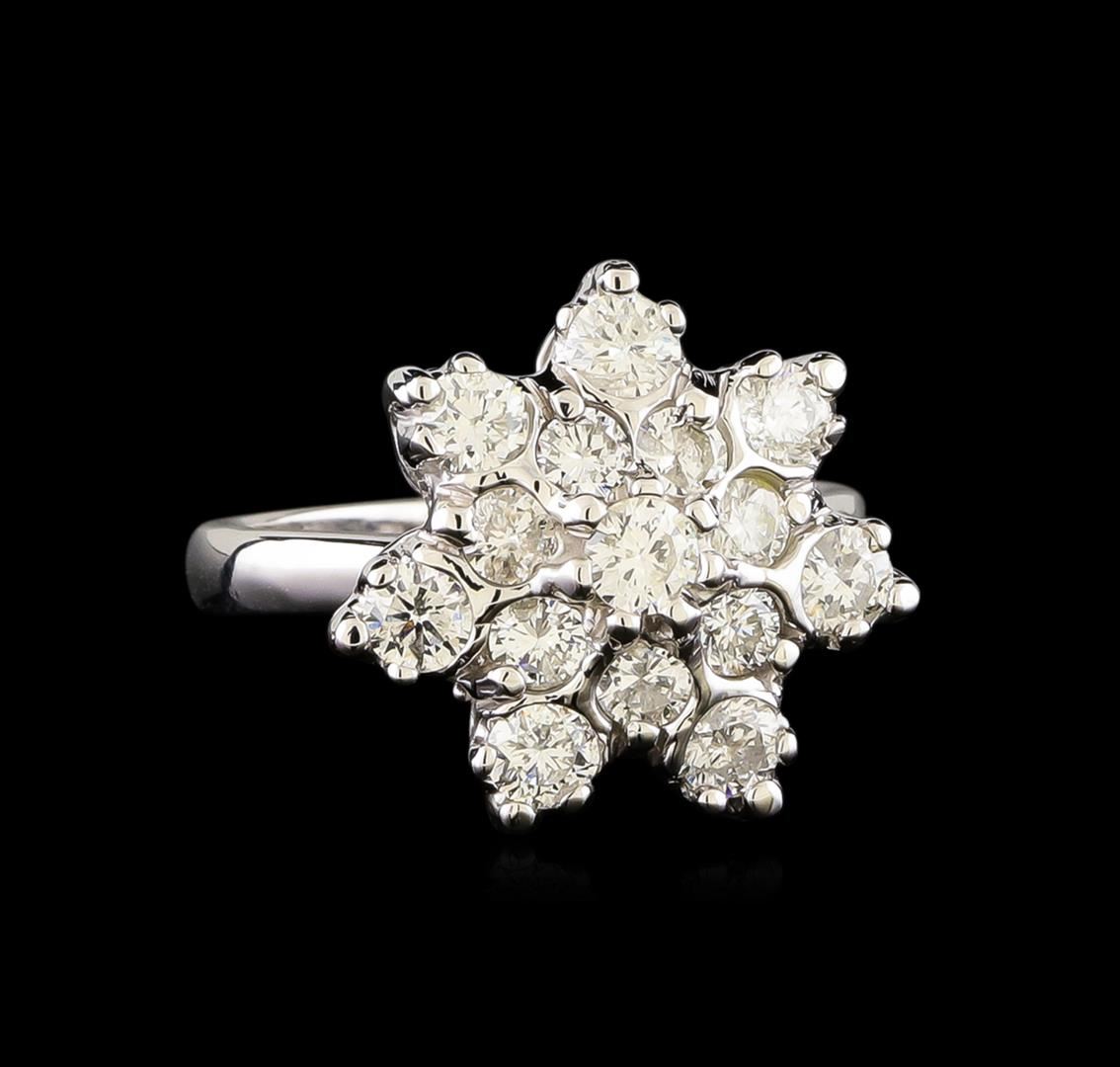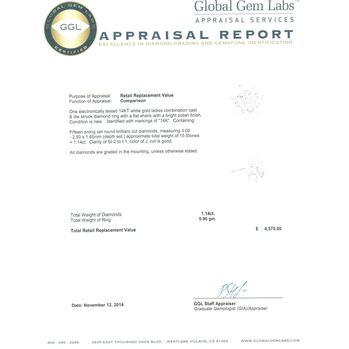 One electronically tested 14KT white gold ladies combination cast & die struck diamond ring with a flat shank with a bright polish finish. Identified with markings of "14K". Condition is new. Containing: Fifteen prong set round brilliant cut diamonds, measuring 3.00 - 2.50 x 1.65mm (depth est.) approximate total weight of 15 Stones = 1.14ct. Clarity: SI-2 to I-1. Color: J, Cut is Good. All diamonds are graded in the mounting, unless otherwise stated. Total Weight of Diamonds 1.14ct. Total Weight of Ring 5.90 grams. GGL Appraised at $4,570.00.