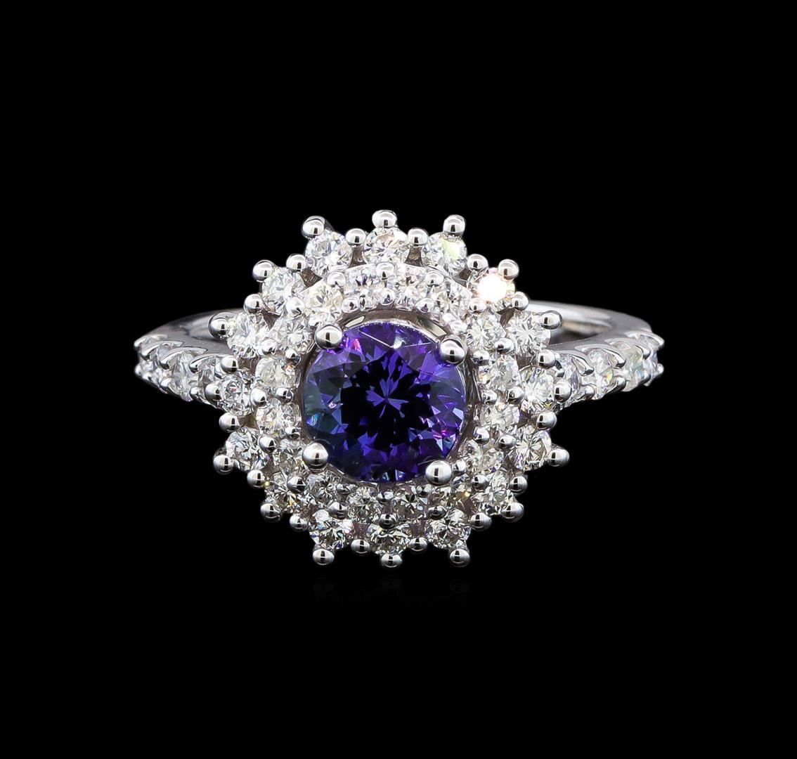 One electronically tested 14KT white gold ladies cast tanzanite and diamond ring with a bright polish finish. Identified with markings of "14K". Condition is new. Containing: One prong set round modified brilliant cut natural tanzanite, measuring 6.40 - 6.40 x 4.16 mm, approximate weight of 1.14ct., clarity is eye clean, type I, medium light, slightly grayish, violet color, (GIA V 4/2), cut is good. Forty prong set round brilliant cut diamonds, measuring 2.00 - 1.60 x 1.08mm (depth est.) approximate total weight of 40 Stones = 0.85ct. Clarity: SI-1 to I-1. Color: I - J, Cut is Good. Colored gemstones are presumed to have been subjected to commonly used enhancement processes. All diamonds and colored gemstones are graded in the mounting, unless otherwise stated. Total Weight of Colored Stones 1.14ct. Total Weight of Diamonds 0.85ct. Total Weight of Ring 5.20 grams. GGL Appraised at $3,685.00.