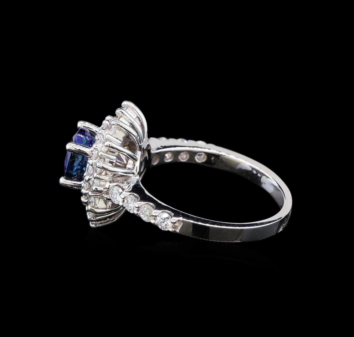 One electronically tested 14KT white gold ladies cast tanzanite and diamond ring with a bright polish finish. Identified with markings of "14K". Condition is new. Containing: One prong set round modified brilliant cut natural tanzanite, measuring 6.40 - 6.40 x 4.16 mm, approximate weight of 1.14ct., clarity is eye clean, type I, medium light, slightly grayish, violet color, (GIA V 4/2), cut is good. Forty prong set round brilliant cut diamonds, measuring 2.00 - 1.60 x 1.08mm (depth est.) approximate total weight of 40 Stones = 0.85ct. Clarity: SI-1 to I-1. Color: I - J, Cut is Good. Colored gemstones are presumed to have been subjected to commonly used enhancement processes. All diamonds and colored gemstones are graded in the mounting, unless otherwise stated. Total Weight of Colored Stones 1.14ct. Total Weight of Diamonds 0.85ct. Total Weight of Ring 5.20 grams. GGL Appraised.