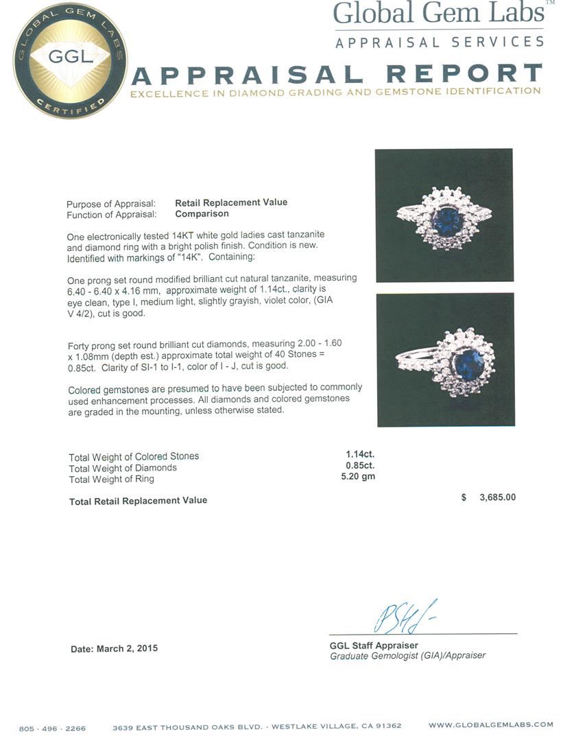 One electronically tested 14KT white gold ladies cast tanzanite and diamond ring with a bright polish finish. Identified with markings of "14K". Condition is new. Containing: One prong set round modified brilliant cut natural tanzanite, measuring 6.40 - 6.40 x 4.16 mm, approximate weight of 1.14ct., clarity is eye clean, type I, medium light, slightly grayish, violet color, (GIA V 4/2), cut is good. Forty prong set round brilliant cut diamonds, measuring 2.00 - 1.60 x 1.08mm (depth est.) approximate total weight of 40 Stones = 0.85ct. Clarity: SI-1 to I-1. Color: I - J, Cut is Good. Colored gemstones are presumed to have been subjected to commonly used enhancement processes. All diamonds and colored gemstones are graded in the mounting, unless otherwise stated. Total Weight of Colored Stones 1.14ct. Total Weight of Diamonds 0.85ct. Total Weight of Ring 5.20 grams. GGL Appraised.
