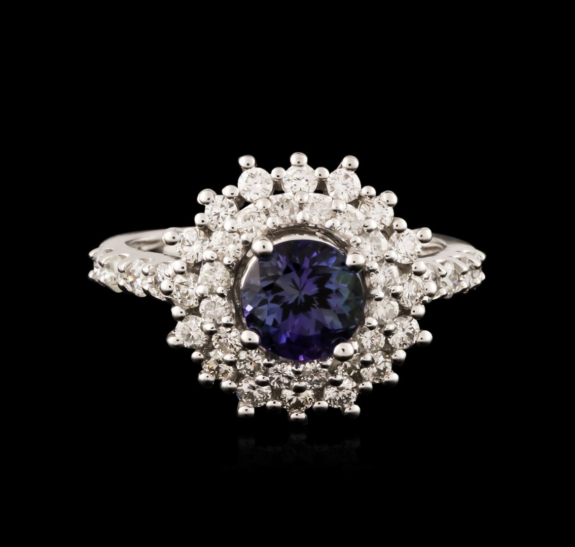 One electronically tested 14KT white gold ladies cast tanzanite and diamond ring with a bright polish finish. Identified with markings of "14K". Condition is new. Containing: One prong set round modified brilliant cut natural tanzanite, measuring 6.40 - 6.40 x 4.16 mm, approximate weight of 1.14ct., clarity is eye clean, type I, medium light, slightly grayish, violet color, (GIA V 4/2), cut is good. Forty prong set round brilliant cut diamonds, measuring 2.00 - 1.60 x 1.08mm (depth est.) approximate total weight of 40 Stones = 0.85ct. Clarity: SI-1 to I-1. Color: I - J, Cut is Good. Colored gemstones are presumed to have been subjected to commonly used enhancement processes. All diamonds and colored gemstones are graded in the mounting, unless otherwise stated. Total Weight of Colored Stones 1.14ct. Total Weight of Diamonds 0.85ct. Total Weight of Ring 5.20 grams. GGL Appraised at $3,685.00.