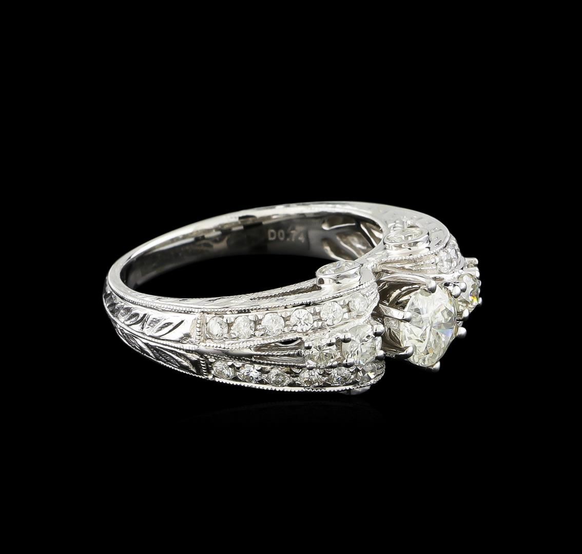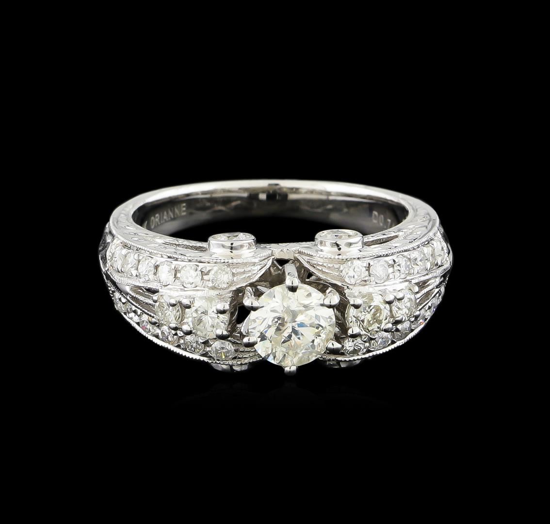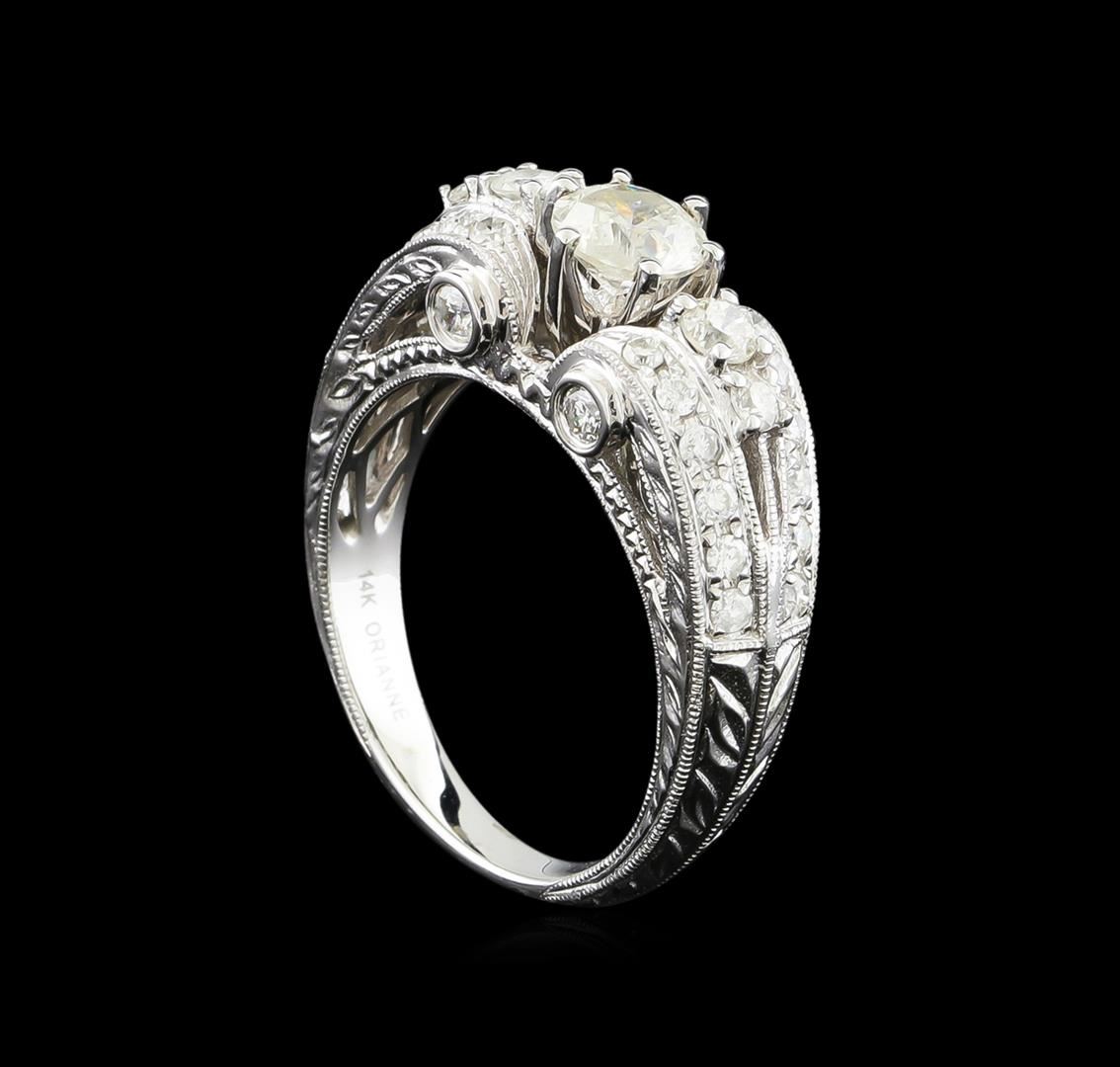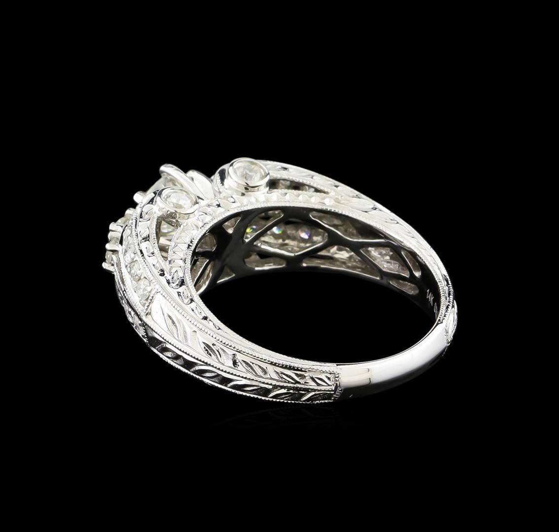 One electronically tested 14KT white gold ladies combination cast & assembled engagement ring with a flat shank with a engraved finish. Identified with markings of "14K". Condition is new. Containing: One prong set round brilliant cut diamond, measuring 5.40 - 5.40 x 3.07mm (depth est.) approximate weight of 0.55ct. Clarity: I-1. Color: K, Cut is Good. Thirty-Two prong set round brilliant cut diamonds, measuring 2.60 - 1.40 x 1.20mm (depth est.) approximate total weight of 32 Stones = 0.60ct. Clarity: SI-2 to I-2. Color: I - J, Cut is Good. All diamonds are graded in the mounting, unless otherwise stated. Total Weight of Diamonds 1.15ct. Total Weight of Ring 6.00 grams. GGL Appraised at $6,350.00.