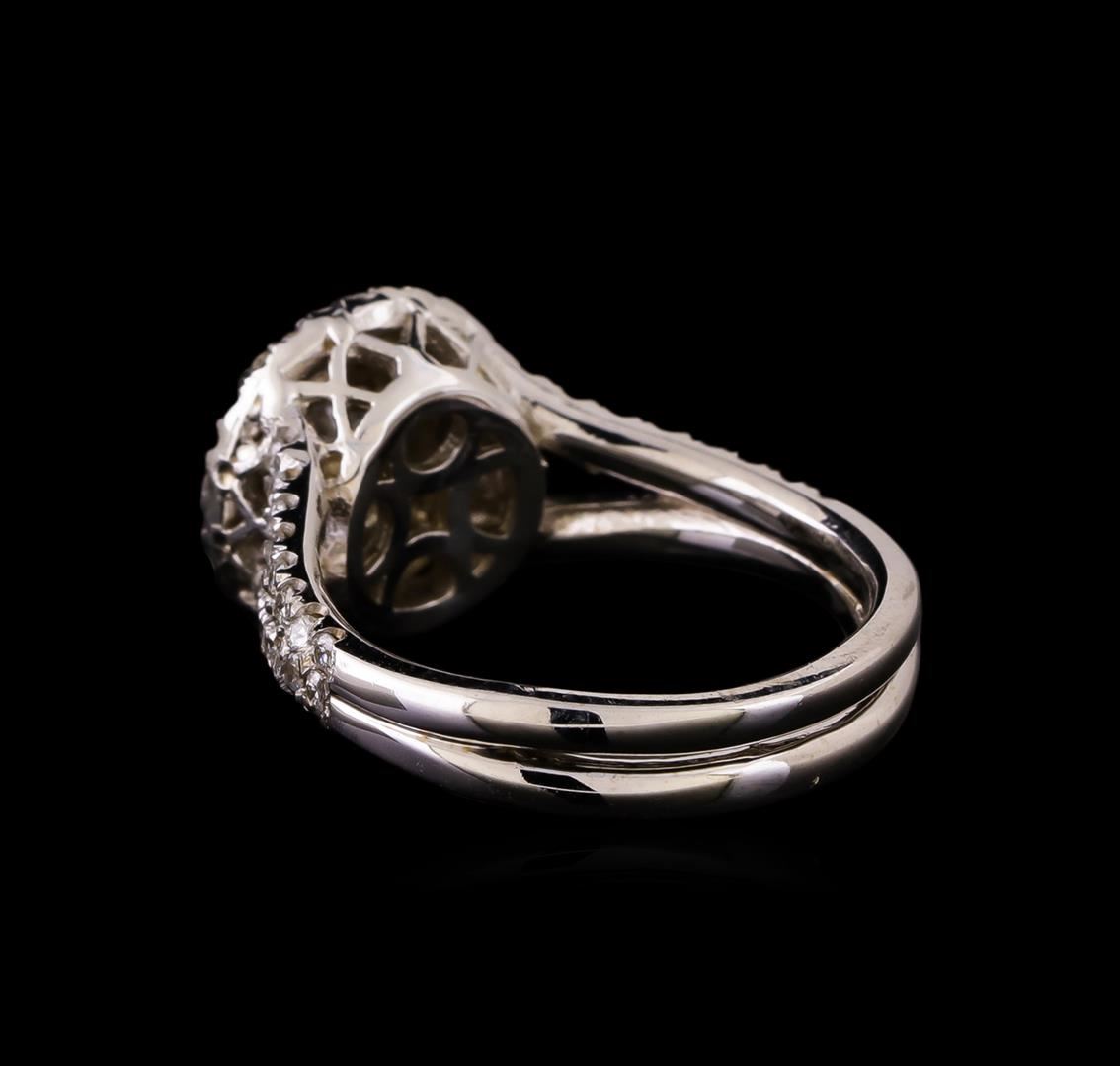 One electronically tested 14KT white gold ladies cast diamond engagement ring with a bright polish finish. Identified with markings of "14K". Condition is new. Containing: One prong set round brilliant cut diamond, measuring 5.30 - 5.30 x 3.18mm (depth est.) approximate weight of 0.55ct. Clarity: I-1. Color: J, Cut is Good. Seventy-Six prong set round brilliant cut diamonds, measuring 1.30 - 1.30 x 0.78mm (depth est.) approximate total weight of 76 Stones = 0.61ct. Clarity: SI-2 to I-2. Color: H - I, Cut is Good. All diamonds are graded in the mounting, unless otherwise stated. Total Weight of Diamonds 1.15ct. Total Weight of Ring 5.60 grams. GGL Appraised at $5,760.00.