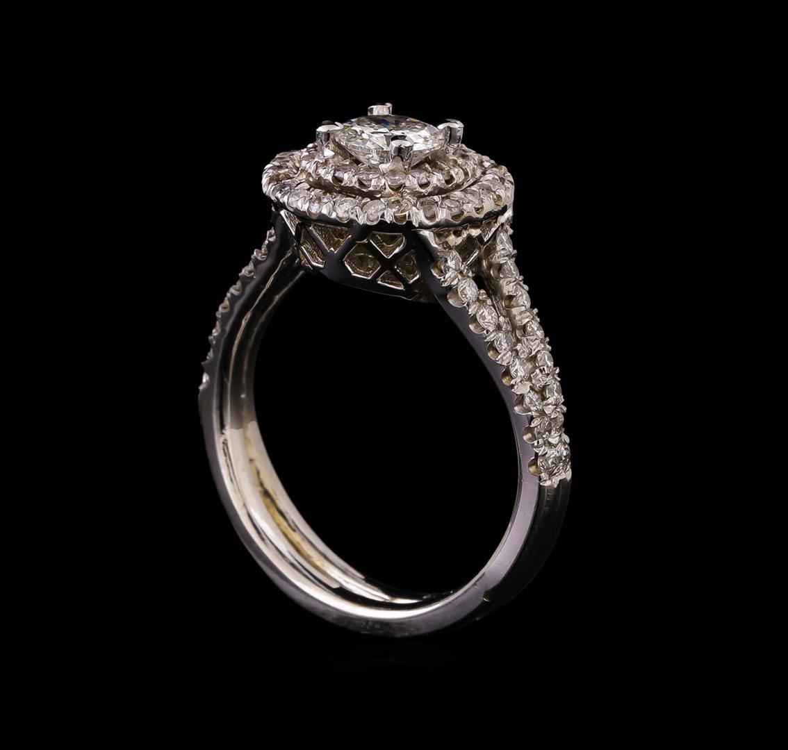 One electronically tested 14KT white gold ladies cast diamond engagement ring with a bright polish finish. Identified with markings of "14K". Condition is new. Containing: One prong set round brilliant cut diamond, measuring 5.30 - 5.30 x 3.18mm (depth est.) approximate weight of 0.55ct. Clarity: I-1. Color: J, Cut is Good. Seventy-Six prong set round brilliant cut diamonds, measuring 1.30 - 1.30 x 0.78mm (depth est.) approximate total weight of 76 Stones = 0.61ct. Clarity: SI-2 to I-2. Color: H - I, Cut is Good. All diamonds are graded in the mounting, unless otherwise stated. Total Weight of Diamonds 1.15ct. Total Weight of Ring 5.60 grams. GGL Appraised.