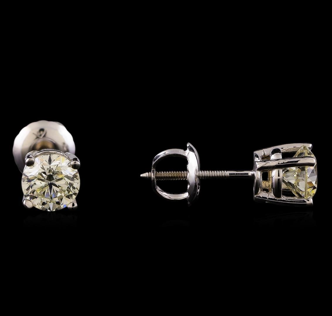 One pair electronically tested 14KT white gold cast & assembled diamond solitaire earrings with screw backs. Bright polish finish. Condition is new, good workmanship. Containing: One prong set round brilliant cut diamond, measuring 4.90 - 4.85 x 3.20mm (depth est.), 4.00% GTCF approximate weight of 0.58ct with a medium blue fluorescence. Graded in the setting. Clarity: SI-2. Color: 65.6%. Table 61.5%. One prong set round brilliant cut diamond, measuring 4.89 - 4.87 x 3.20mm (depth est.), 3.00% GTCF approximate weight of 0.57ct with a faint blue fluorescence. Graded in the setting. Clarity: I-1. Color: 65.6%. Table 57.4%. Total Weight of Diamonds 1.15ct. Total Weight of Earrings 1.02 grams. AIG Appraised at $5,265.00.