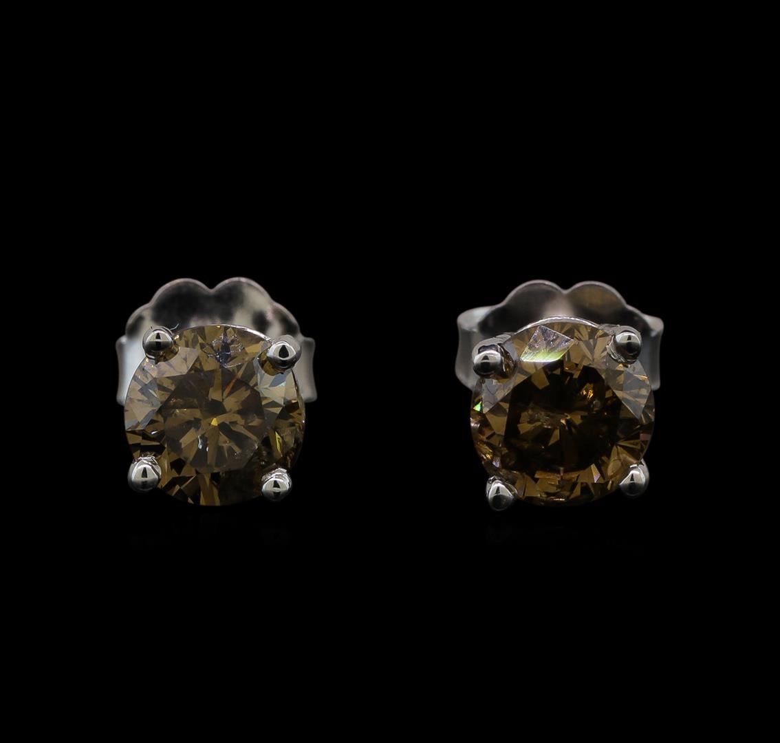 One pair electronically tested 14KT white gold ladies cast diamond stud earrings with friction posts with a bright polish finish. Identified with markings of "14K". Condition is new. Containing: Two prong set round brilliant cut diamonds, measuring 5.40 - 5.40 x 3.24mm (depth est.) approximate total weight of 2 Stones = 1.15ct. Clarity: I-1, Cut is Good. Diamonds are graded in the mounting, unless otherwise stated. Total Weight of Diamonds 1.15ct. Total Weight of Stud Earrings 1.20 grams. GGL Appraised at $1,925.00.