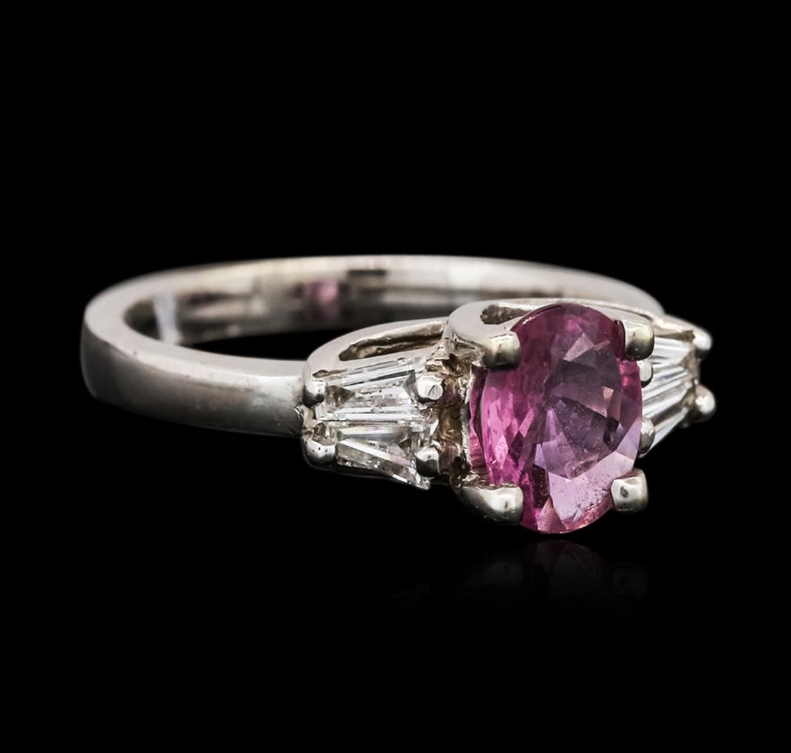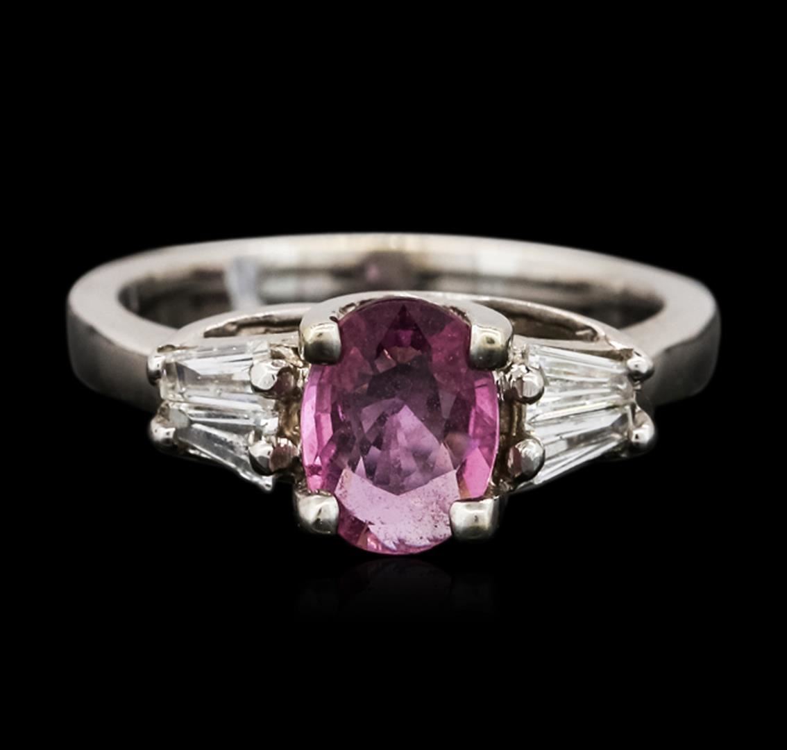 One ring featuring: 14KT white gold weighing 4.90 grams containing one pink sapphire center stone with a total weight of 1.15ct and baguette cut diamonds with a total weight of 0.40ct.