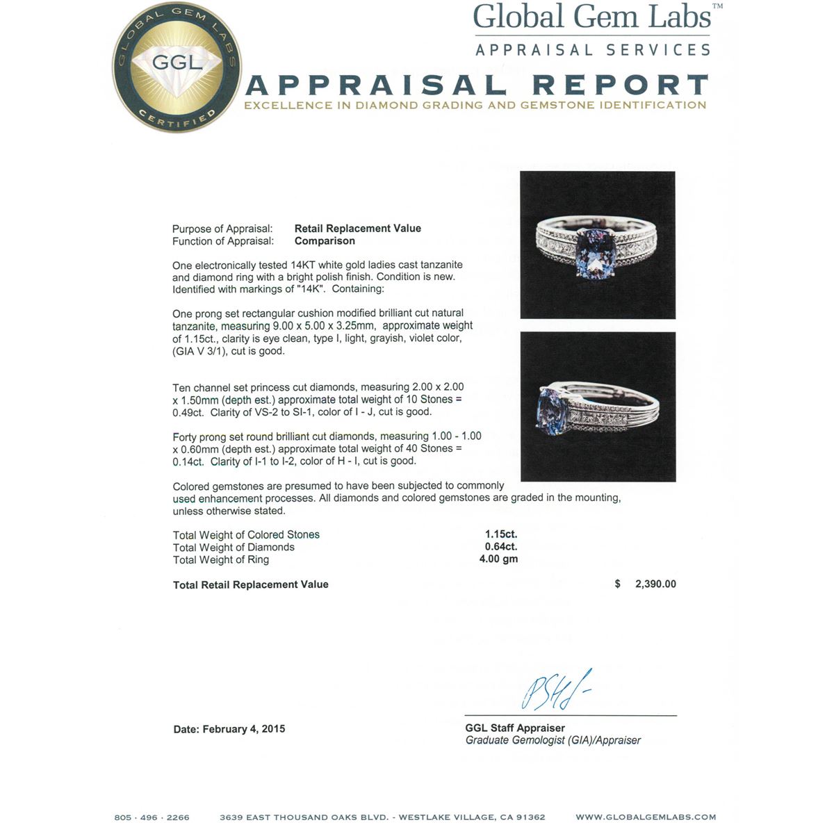One electronically tested 14KT white gold ladies cast tanzanite and diamond ring with a bright polish finish. Identified with markings of "14K". Condition is new. Containing: One prong set rectangular cushion modified brilliant cut natural tanzanite, measuring 9.00. x 5.00. x 3.25mm, approximate weight of 1.15ct., clarity is eye clean, type I, light, grayish, violet color, (GIA V 3/1), cut is good. Ten channel set princess cut diamonds, measuring 2.00. x 2.00. x 1.50mm (depth est.) approximate total weight of 10 Stones = 0.49ct. Clarity: VS-2 to SI-1. Color: I - J, Cut is Good. Forty prong set round brilliant cut diamonds, measuring 1.00. - 1.00. x 0.60mm (depth est.) approximate total weight of 40 Stones = 0.14ct. Clarity: I-1 to I-2. Color: H - I, Cut is Good. Colored gemstones are presumed to have been subjected to commonly used enhancement processes. All diamonds and colored gemstones are graded in the mounting, unless otherwise stated. Total Weight of Colored Stones 1.15ct. Total Weight of Diamonds 0.64ct. Total Weight of Ring 4.00 grams. GGL Appraised at $2,390.00.