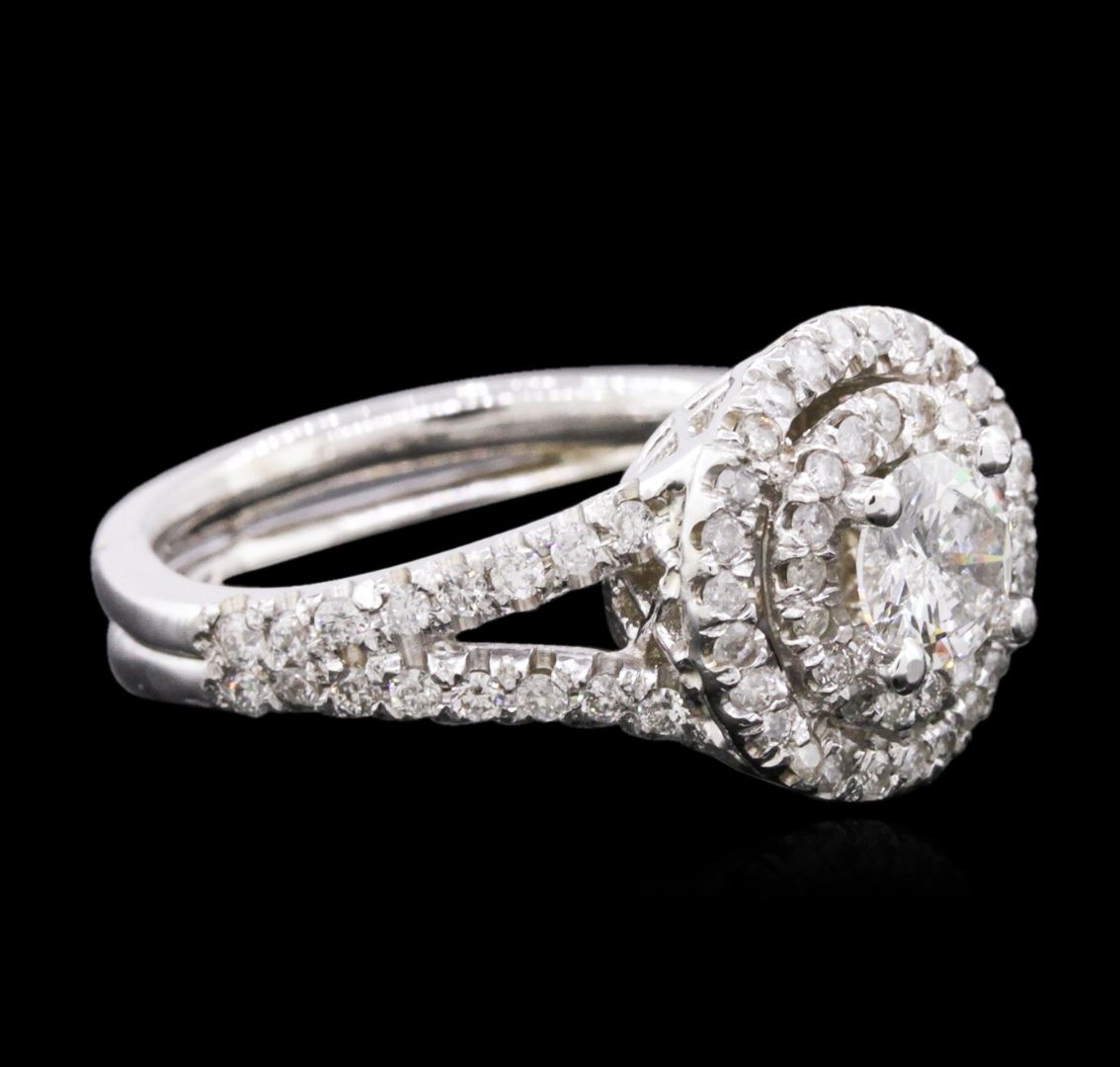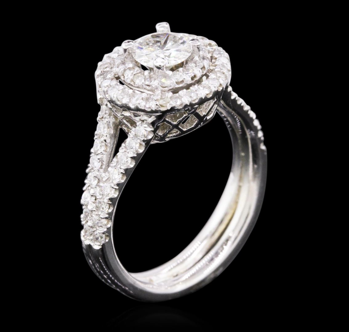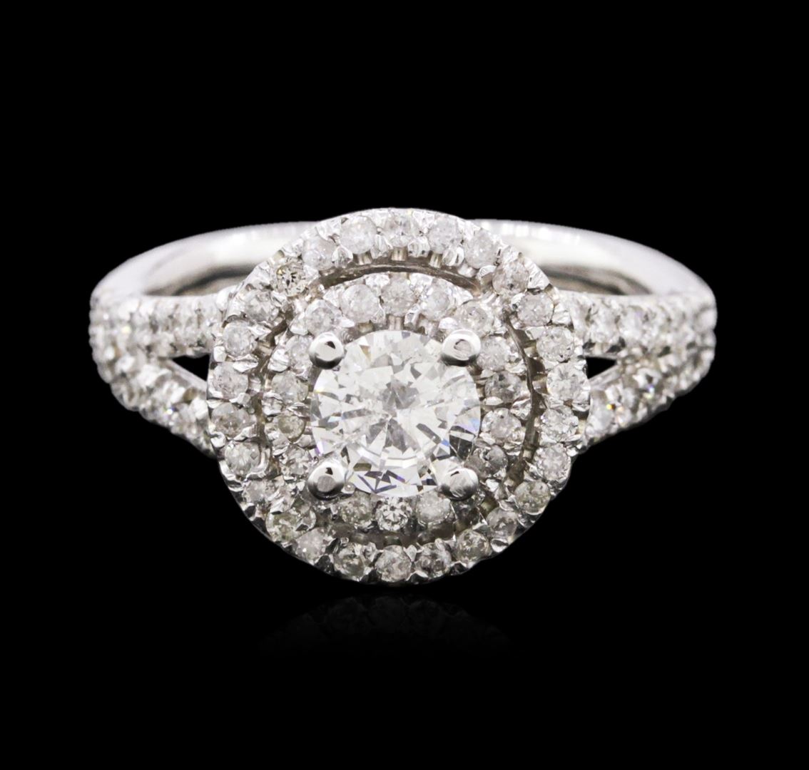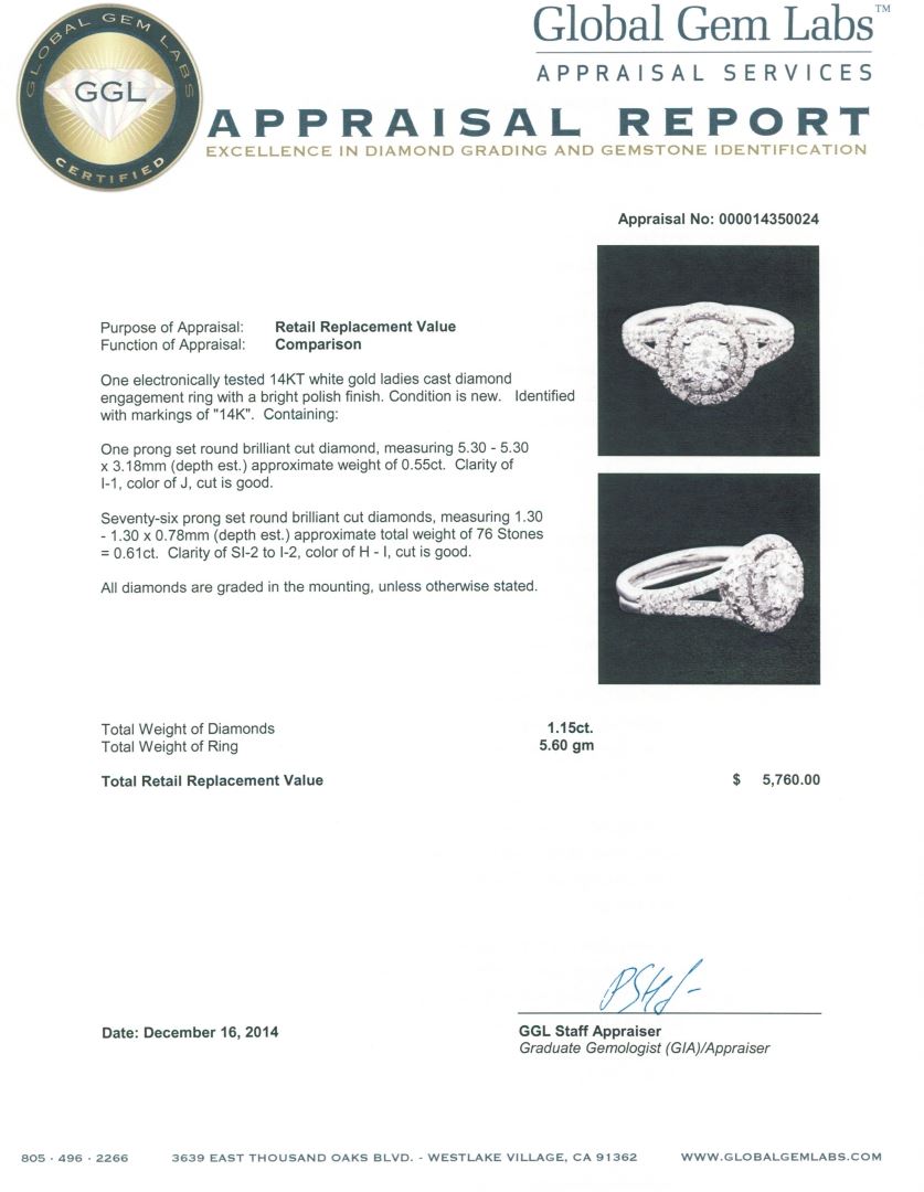 One electronically tested 14KT white gold ladies cast diamond engagement ring with a bright polish finish. Identified with markings of "14K". Condition is new. Containing: One prong set round brilliant cut diamond, measuring 5.30 - 5.30 x 3.18mm (depth est.) approximate weight of 0.55ct. Clarity: I-1. Color: J, Cut is Good. Seventy-Six prong set round brilliant cut diamonds, measuring 1.30 - 1.30 x 0.78mm (depth est.) approximate total weight of 76 Stones = 0.61ct. Clarity: SI-2 to I-2. Color: H - I, Cut is Good. All diamonds are graded in the mounting, unless otherwise stated. Total Weight of Diamonds 1.15ct. Total Weight of Ring 5.60 grams. GGL Appraised at $5,760.00.