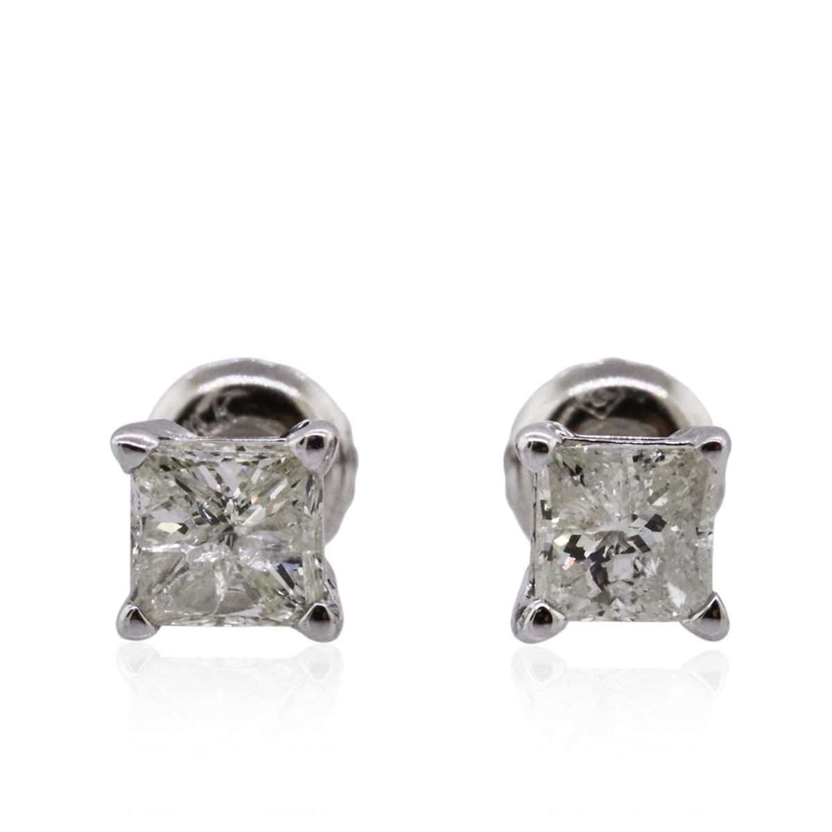 One pair electronically tested 14KT white gold cast & assembled diamond solitaire earrings with screw backs. Bright polish finish. Condition is new, good workmanship. Containing: One prong set princess cut diamond, measuring 4.30 x 4.20 x 3.50mm (depth est.), 4.00.%. GTCF approximate weight of 0.64ct with a faint red fluorescence. Graded in the setting. Clarity: I-2. Color: 83.3%. Table 88.1%. One prong set princess cut diamond, measuring 4.05 x 4.00 x 2.90mm (depth est.), 6.00.%. GTCF approximate weight of 0.51ct with a medium blue fluorescence. Graded in the setting. Clarity: I-2. Color: 72.5%. Table 82.5%. Total Weight of Diamonds 1.15ct. Total Weight of Earrings 1.00 grams. AIG Appraised at $2,355.00.