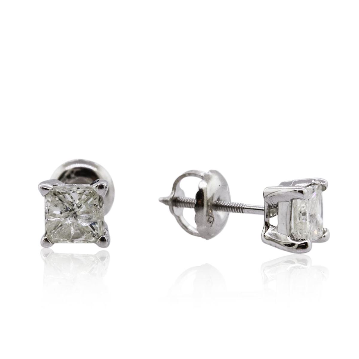 One pair electronically tested 14KT white gold cast & assembled diamond solitaire earrings with screw backs. Bright polish finish. Condition is new, good workmanship. Containing: One prong set princess cut diamond, measuring 4.30 x 4.20 x 3.50mm (depth est.), 4.00.%. GTCF approximate weight of 0.64ct with a faint red fluorescence. Graded in the setting. Clarity: I-2. Color: 83.3%. Table 88.1%. One prong set princess cut diamond, measuring 4.05 x 4.00 x 2.90mm (depth est.), 6.00.%. GTCF approximate weight of 0.51ct with a medium blue fluorescence. Graded in the setting. Clarity: I-2. Color: 72.5%. Table 82.5%. Total Weight of Diamonds 1.15ct. Total Weight of Earrings 1.00 grams. AIG Appraised at $2,355.00.