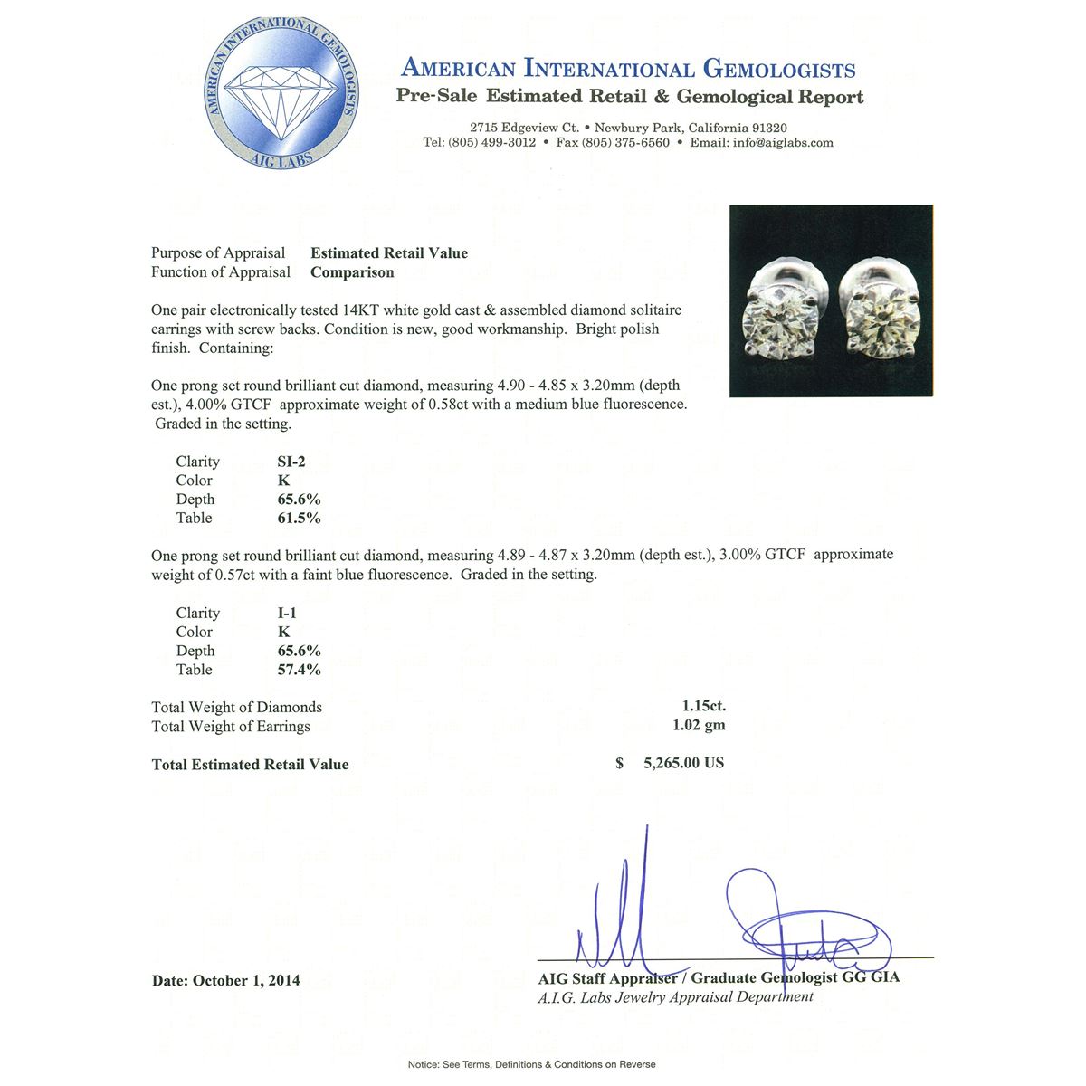 One pair electronically tested 14KT white gold cast & assembled diamond solitaire earrings with screw backs. Bright polish finish. Condition is new, good workmanship. Containing: One prong set round brilliant cut diamond, measuring 4.90 - 4.85 x 3.20mm (depth est.), 4.00% GTCF approximate weight of 0.58ct with a medium blue fluorescence. Graded in the setting. Clarity: SI-2. Color: 65.6%. Table 61.5%. One prong set round brilliant cut diamond, measuring 4.89 - 4.87 x 3.20mm (depth est.), 3.00% GTCF approximate weight of 0.57ct with a faint blue fluorescence. Graded in the setting. Clarity: I-1. Color: 65.6%. Table 57.4%. Total Weight of Diamonds 1.15ct. Total Weight of Earrings 1.02 grams. AIG Appraised at $5,265.00.