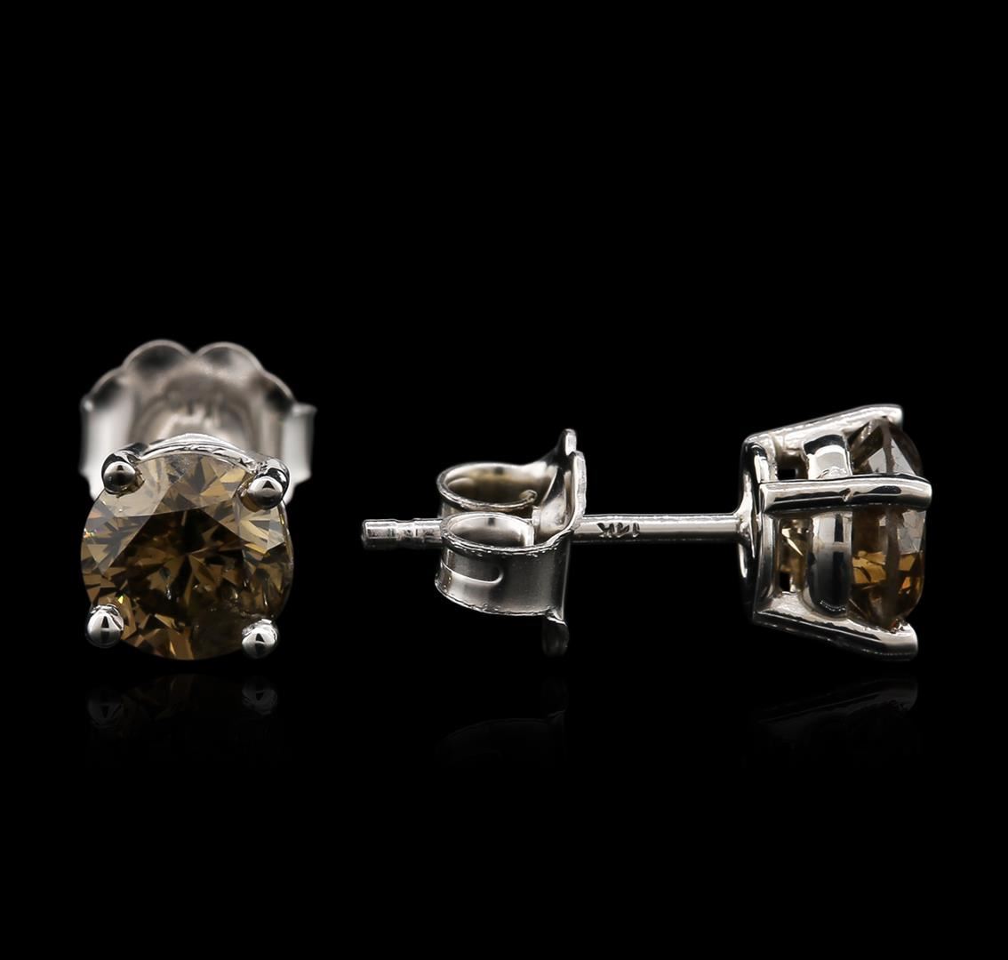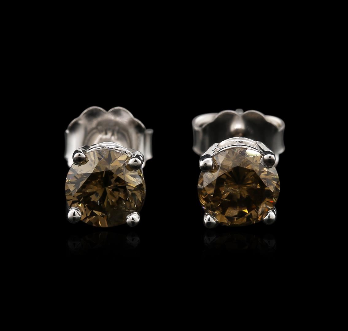 One pair electronically tested 14KT white gold ladies cast diamond stud earrings with friction posts with a bright polish finish. Identified with markings of "14K". Condition is new. Containing: Two prong set round brilliant cut diamonds, measuring 5.40 - 5.40 x 3.24mm (depth est.) approximate total weight of 2 Stones = 1.15ct. Clarity: I-1, Cut is Good. Diamonds are graded in the mounting, unless otherwise stated. Total Weight of Diamonds 1.15ct. Total Weight of Stud Earrings 1.20 grams. GGL Appraised at $1,925.00.
