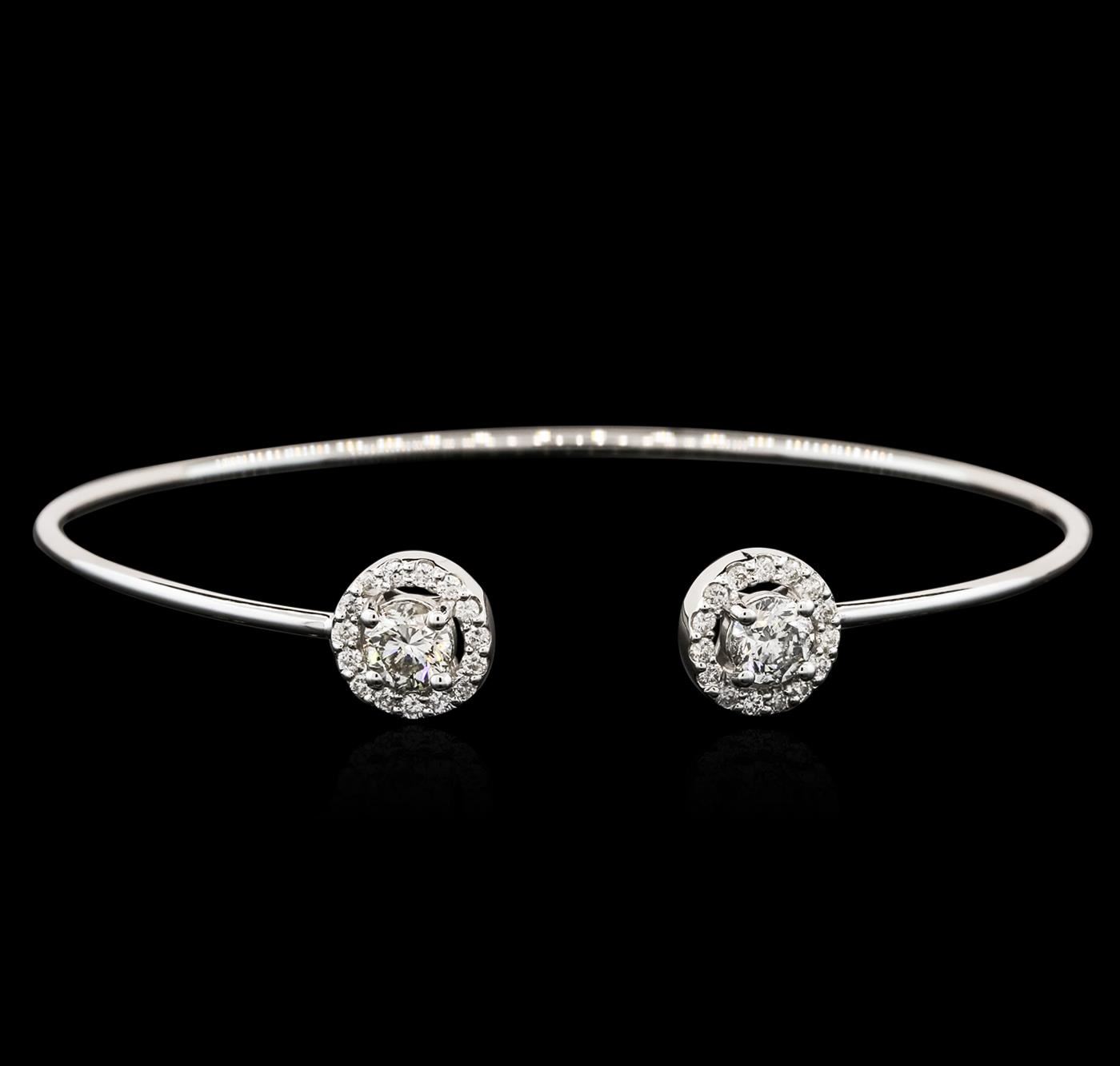 One electronically tested 14KT white gold ladies cast diamond bangle bracelet with a bright polish finish. Condition is new. Containing: Two prong set round brilliant cut diamonds, measuring 5.00 - 5.00 x 3.00mm (depth est.) approximate total weight of 2 Stones = 0.92ct. Clarity: SI-2 to I-1. Color: J - K, Cut is Good. Thirty prong set round brilliant cut diamonds, measuring 1.30 - 1.30 x 0.78mm (depth est.) approximate total weight of 30 Stones = 0.24ct. Clarity: SI-2. Color: I - J, Cut is Good. All diamonds are graded in the mounting, unless otherwise stated. Total Weight of Diamonds 1.16ct. Total Weight of Bangle Bracelet 5.40 grams. GGL Appraised at $5,505.00.