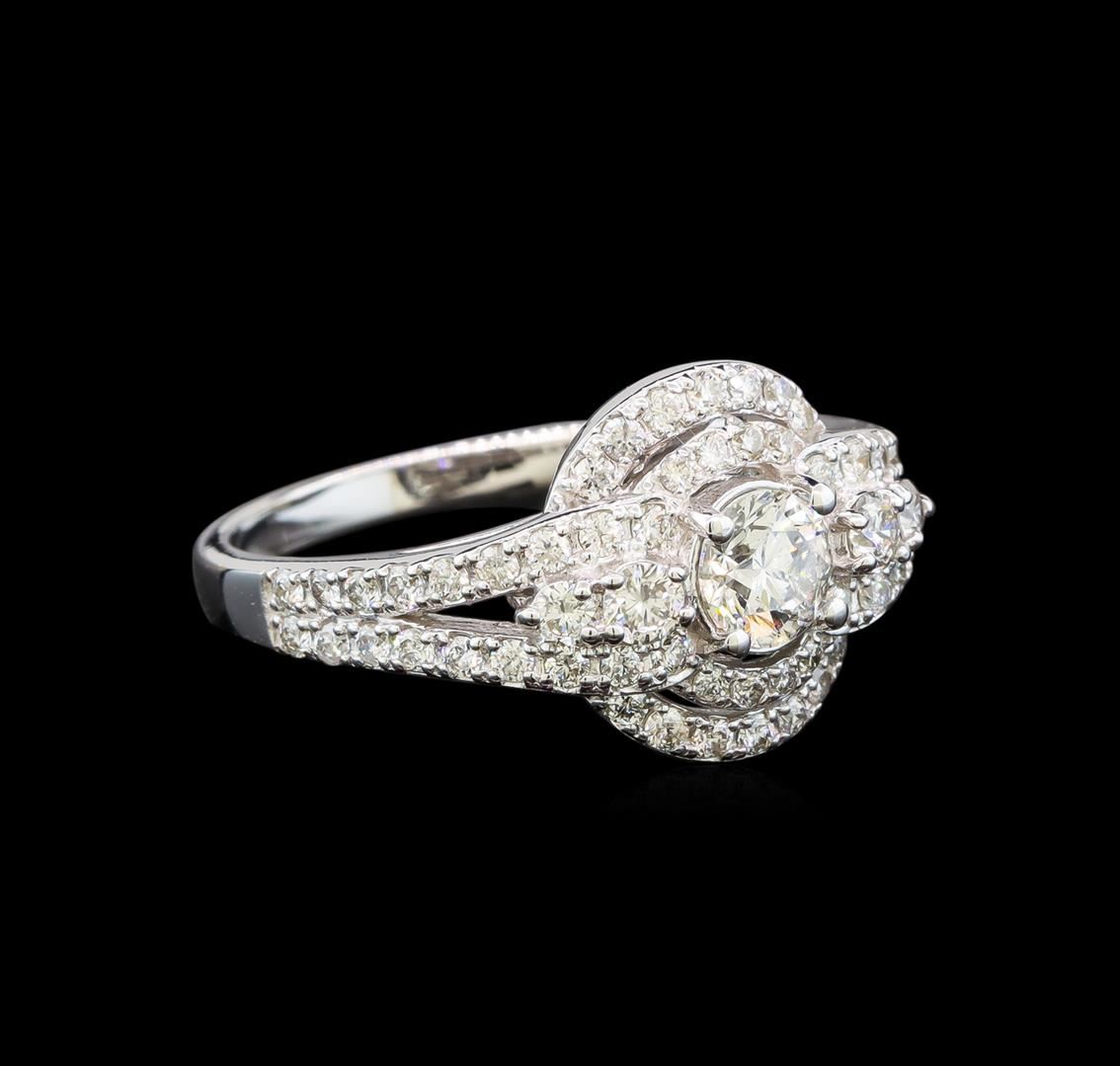 One electronically tested 14KT white gold ladies cast diamond engagement ring with a bright polish finish. Identified with markings of "14K". Condition is new. Containing: One prong set round brilliant cut diamond, measuring 5.00 - 5.00 x 3.00mm (depth est.) approximate weight of 0.46ct. Clarity: I-1. Color: J, Cut is Good. Sixty prong set round brilliant cut diamonds, measuring 2.50 - 1.20 x 1.11mm (depth est.) approximate total weight of 60 Stones = 0.70ct. Clarity: SI-1 to I-1. Color: H - I, Cut is Good. All diamonds are graded in the mounting, unless otherwise stated. Total Weight of Diamonds 1.16ct. Total Weight of Ring 5.00 grams. GGL Appraised at $4,125.00.