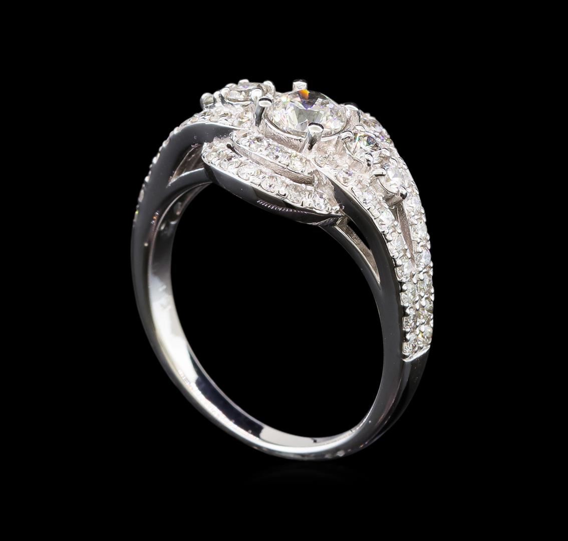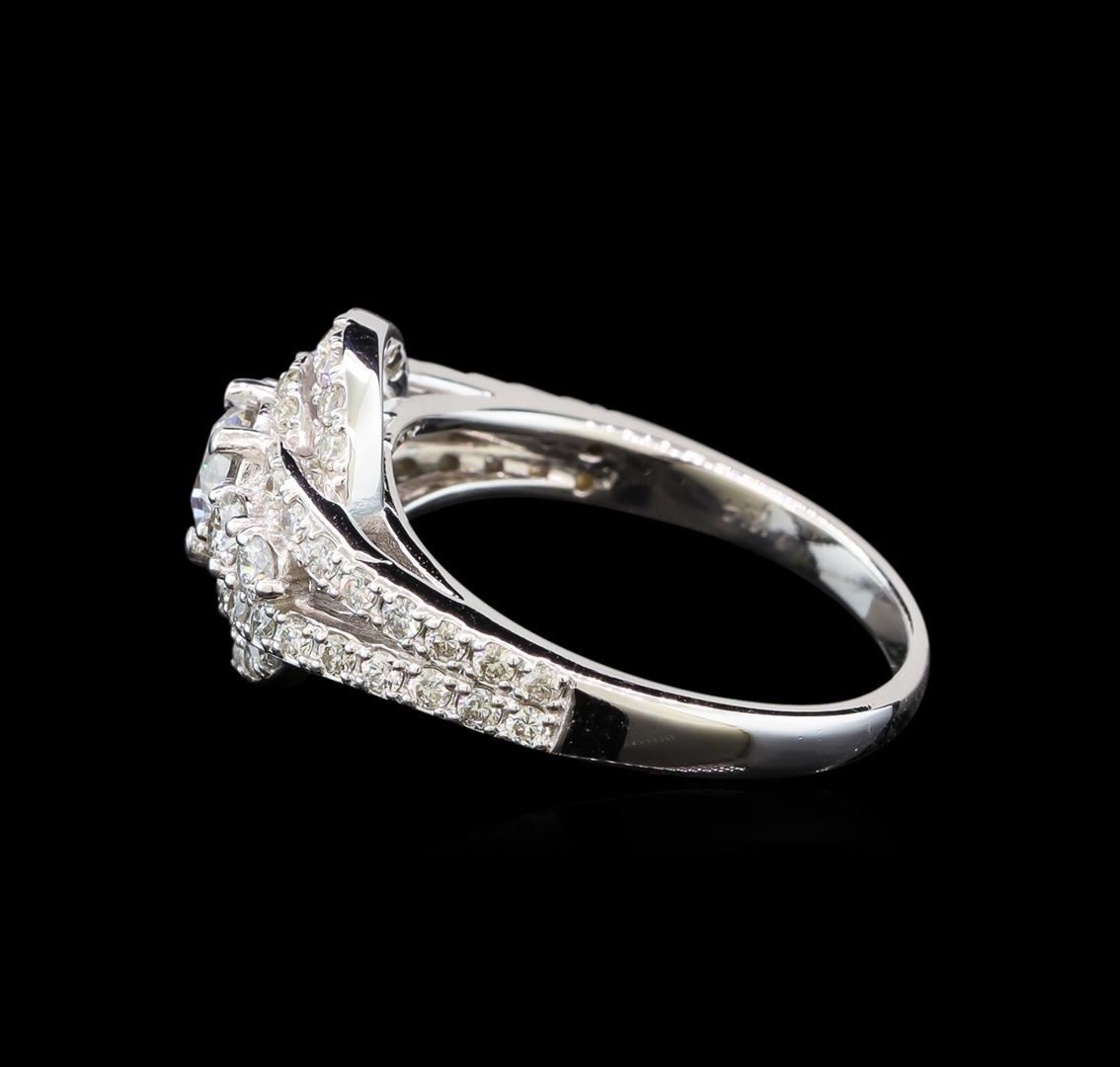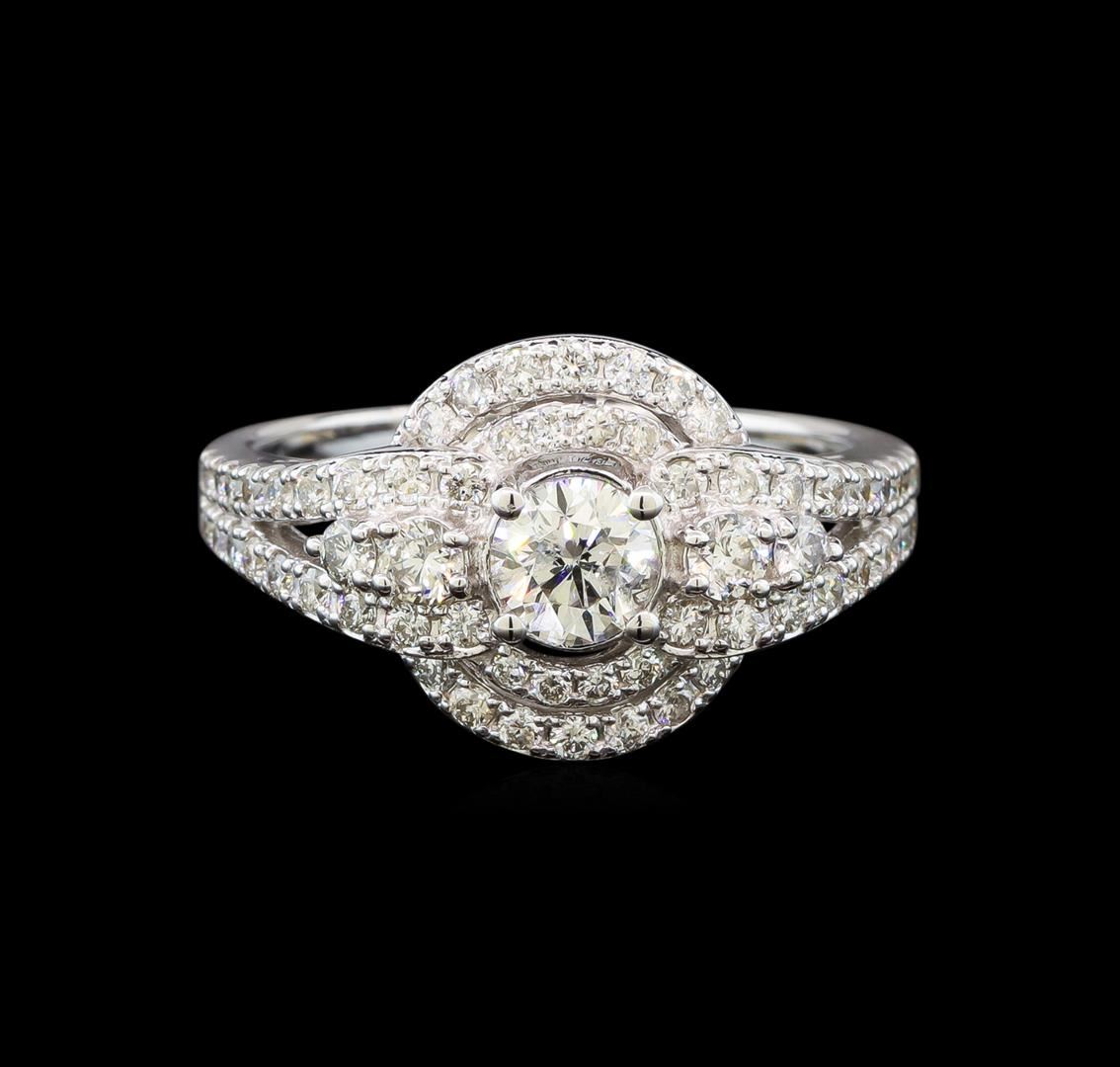 One electronically tested 14KT white gold ladies cast diamond engagement ring with a bright polish finish. Identified with markings of "14K". Condition is new. Containing: One prong set round brilliant cut diamond, measuring 5.00 - 5.00 x 3.00mm (depth est.) approximate weight of 0.46ct. Clarity: I-1. Color: J, Cut is Good. Sixty prong set round brilliant cut diamonds, measuring 2.50 - 1.20 x 1.11mm (depth est.) approximate total weight of 60 Stones = 0.70ct. Clarity: SI-1 to I-1. Color: H - I, Cut is Good. All diamonds are graded in the mounting, unless otherwise stated. Total Weight of Diamonds 1.16ct. Total Weight of Ring 5.00 grams. GGL Appraised at $4,125.00.
