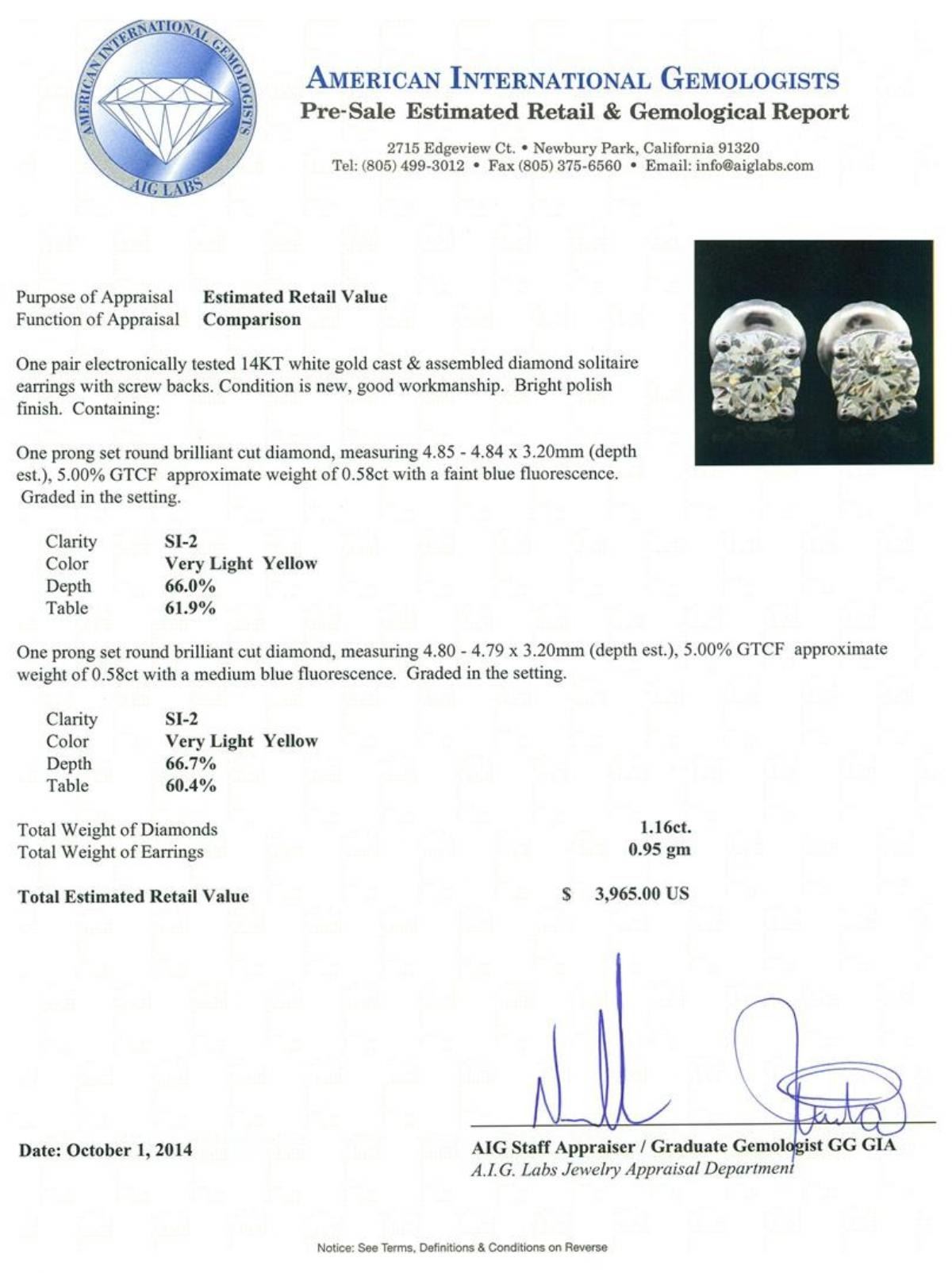One pair electronically tested 14KT white gold cast & assembled diamond solitaire earrings with screw backs. Bright polish finish. Condition is new, good workmanship. Containing: One prong set round brilliant cut diamond, measuring 4.85 - 4.84 x 3.20mm (depth est.), 5.00% GTCF approximate weight of 0.58ct with a faint blue fluorescence. Graded in the setting. Clarity: SI-2. Depth: 66.0%. Table 61.9%. One prong set round brilliant cut diamond, measuring 4.80 - 4.79 x 3.20mm (depth est.), 5.00% GTCF approximate weight of 0.58ct with a medium blue fluorescence. Graded in the setting. Clarity: SI-2. Depth: 66.7%. Table 60.4%. Total Weight of Diamonds 1.16ct. Total Weight of Earrings 0.95 grams. AIG Appraised.