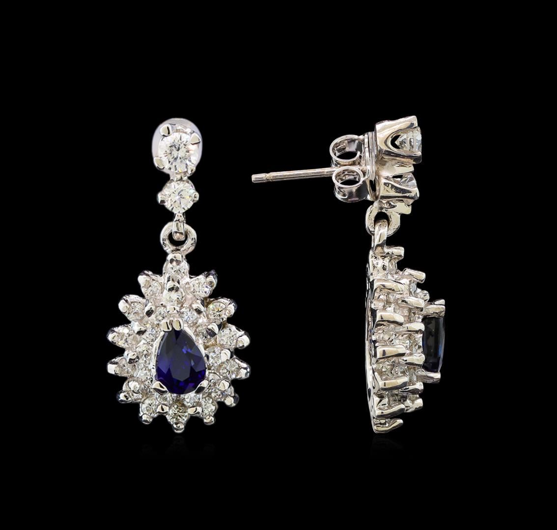 One pair electronically tested 14KT white gold ladies cast sapphire and diamond earrings with friction posts with a bright polish finish. Identified with markings of "585". Condition is new. Containing: Two prong set pear modified brilliant cut natural blue sapphires, measuring 7.00 x 4.00 x 2.60mm, approximate total weight of 1.16ct., clarity is heavily included, type II, dark, strong, blue color, (GIA B 7/5), cut is good. Forty-Eight prong set round brilliant cut diamonds, measuring 1.30 - 1.30 x 0.78mm (depth est.) approximate total weight of 48 Stones = 0.38ct. Clarity: SI-2 to I-1. Color: I - J, Cut is Good. Four prong set round brilliant cut diamonds, measuring 3.10 - 2.60 x 1.71mm (depth est.) approximate total weight of 4 Stones = 0.34ct. Clarity: SI-1 to SI-2. Color: I - J, Cut is Good. Colored gemstones are presumed to have been subjected to commonly used enhancement processes. All colored gemstones are graded in the mounting, unless otherwise stated. Total Weight of Colored Stones 1.16ct. Total Weight of Diamonds 0.72ct. Total Weight of Earrings 5.80 grams. GGL Appraised at $2,130.00.