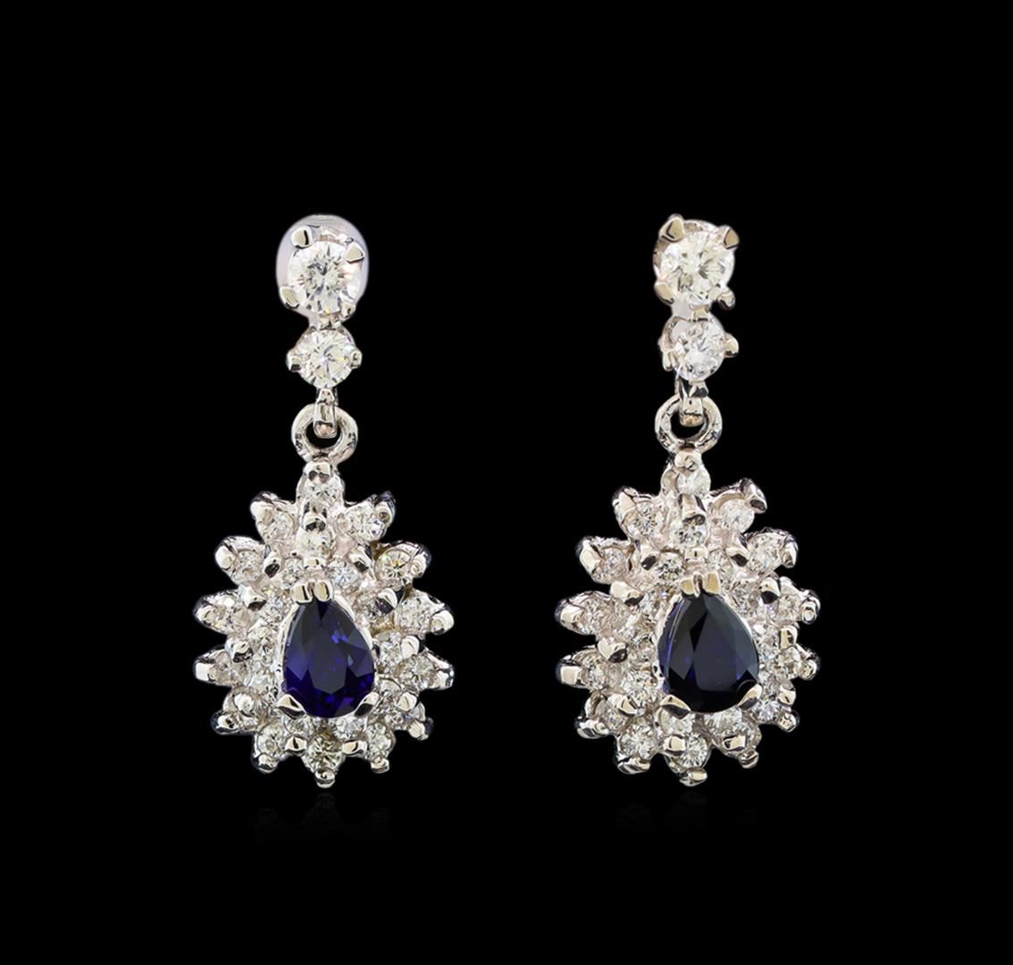 One pair electronically tested 14KT white gold ladies cast sapphire and diamond earrings with friction posts with a bright polish finish. Identified with markings of "585". Condition is new. Containing: Two prong set pear modified brilliant cut natural blue sapphires, measuring 7.00 x 4.00 x 2.60mm, approximate total weight of 1.16ct., clarity is heavily included, type II, dark, strong, blue color, (GIA B 7/5), cut is good. Forty-Eight prong set round brilliant cut diamonds, measuring 1.30 - 1.30 x 0.78mm (depth est.) approximate total weight of 48 Stones = 0.38ct. Clarity: SI-2 to I-1. Color: I - J, Cut is Good. Four prong set round brilliant cut diamonds, measuring 3.10 - 2.60 x 1.71mm (depth est.) approximate total weight of 4 Stones = 0.34ct. Clarity: SI-1 to SI-2. Color: I - J, Cut is Good. Colored gemstones are presumed to have been subjected to commonly used enhancement processes. All colored gemstones are graded in the mounting, unless otherwise stated. Total Weight of Colored Stones 1.16ct. Total Weight of Diamonds 0.72ct. Total Weight of Earrings 5.80 grams. GGL Appraised at $2,130.00.
