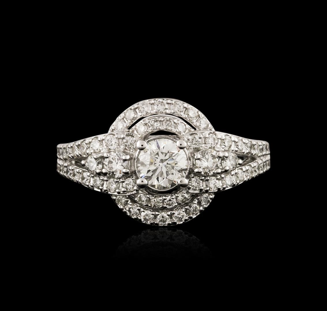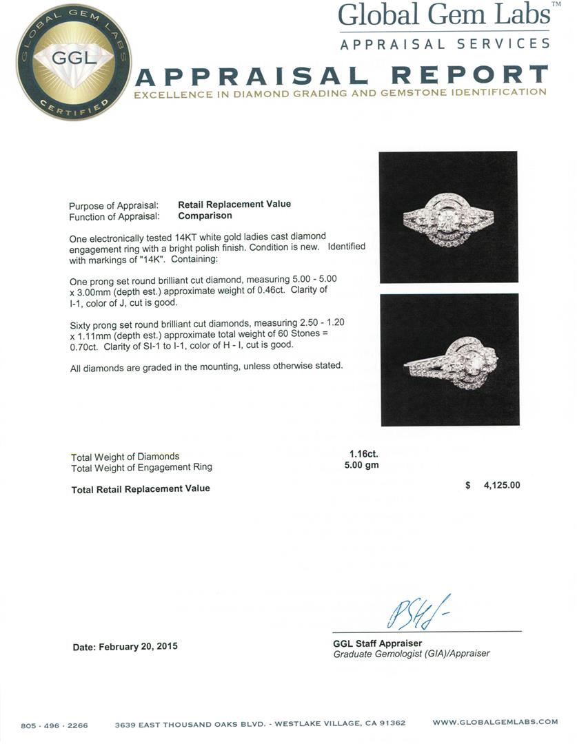 One electronically tested 14KT white gold ladies cast diamond engagement ring with a bright polish finish. Identified with markings of "14K". Condition is new. Containing: One prong set round brilliant cut diamond, measuring 5.00 - 5.00 x 3.00mm (depth est.) approximate weight of 0.46ct. Clarity: I-1. Color: J, Cut is Good. Sixty prong set round brilliant cut diamonds, measuring 2.50 - 1.20 x 1.11mm (depth est.) approximate total weight of 60 Stones = 0.70ct. Clarity: SI-1 to I-1. Color: H - I, Cut is Good. All diamonds are graded in the mounting, unless otherwise stated. Total Weight of Diamonds 1.16ct. Total Weight of Ring 5.00 grams. GGL Appraised at $4,125.00.