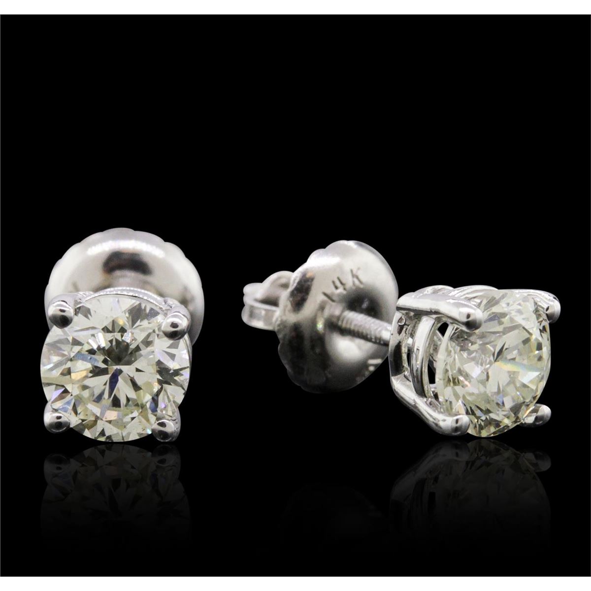 One pair electronically tested 14KT white gold cast & assembled diamond solitaire earrings with screw backs. Bright polish finish. Condition is new, good workmanship. Containing: One prong set round brilliant cut diamond, measuring 4.85 - 4.84 x 3.20mm (depth est.), 5.00% GTCF approximate weight of 0.58ct with a faint blue fluorescence. Graded in the setting. Clarity: SI-2. Depth: 66.0%. Table 61.9%. One prong set round brilliant cut diamond, measuring 4.80 - 4.79 x 3.20mm (depth est.), 5.00% GTCF approximate weight of 0.58ct with a medium blue fluorescence. Graded in the setting. Clarity: SI-2. Depth: 66.7%. Table 60.4%. Total Weight of Diamonds 1.16ct. Total Weight of Earrings 0.95 grams. AIG Appraised at $3,965.00.