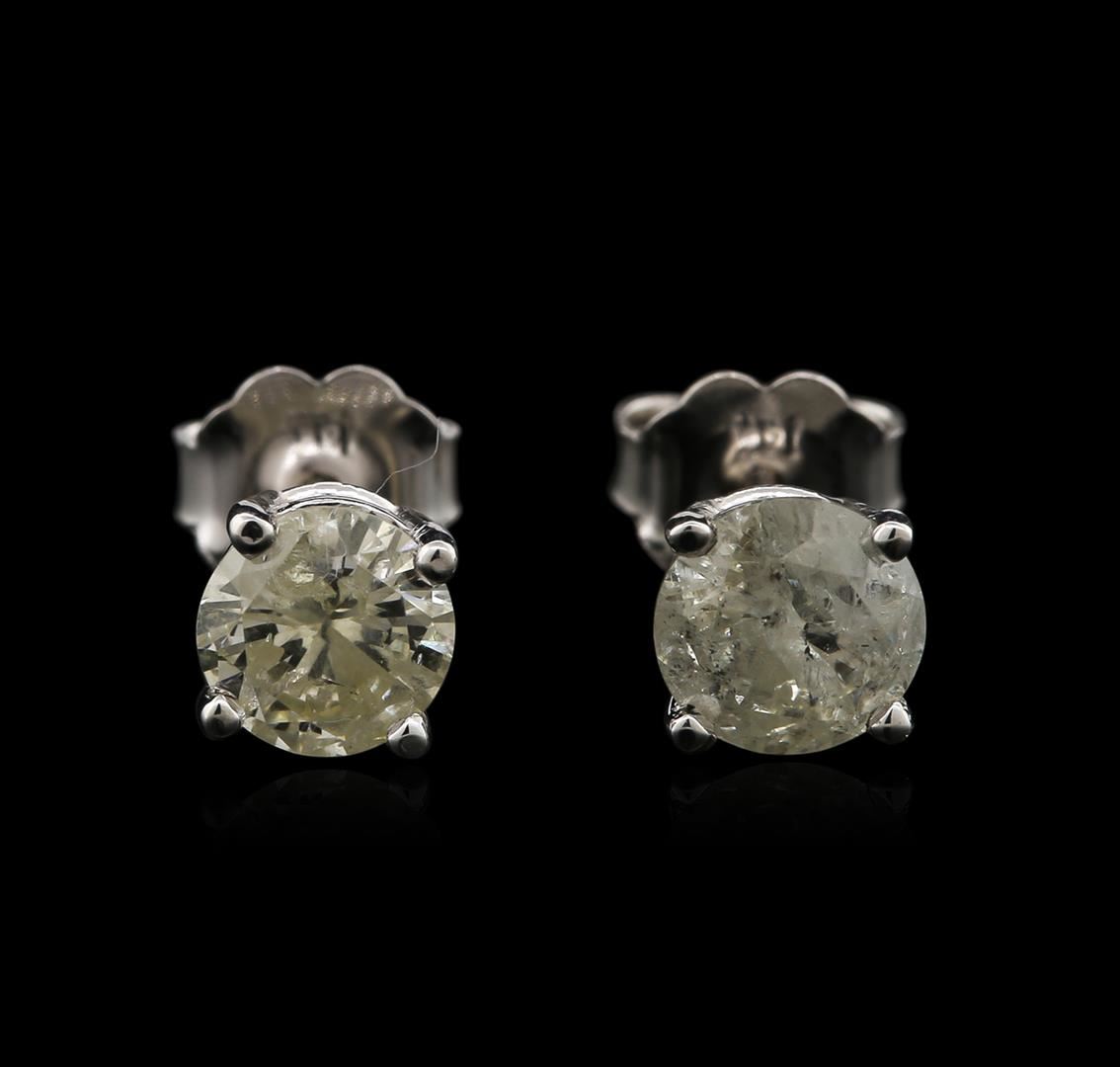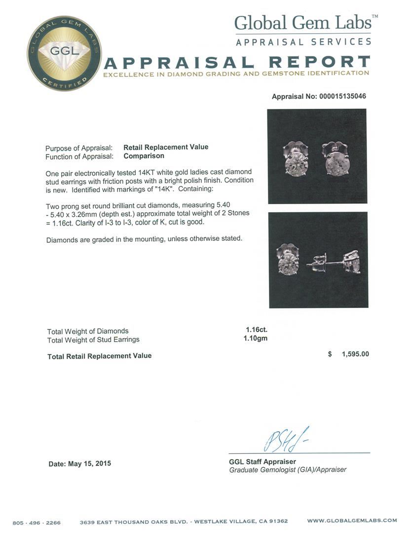One pair electronically tested 14KT white gold ladies cast diamond stud earrings with friction posts with a bright polish finish. Identified with markings of "14K". Condition is new. Containing: Two prong set round brilliant cut diamonds, measuring 5.40 - 5.40 x 3.26mm (depth est.) approximate total weight of 2 Stones = 1.16ct. Clarity: I-3 to I-3. Color: K, Cut is Good. Diamonds are graded in the mounting, unless otherwise stated. Total Weight of Diamonds 1.16ct. Total Weight of Stud Earrings 1.10 grams. GGL Appraised at $1,595.00.