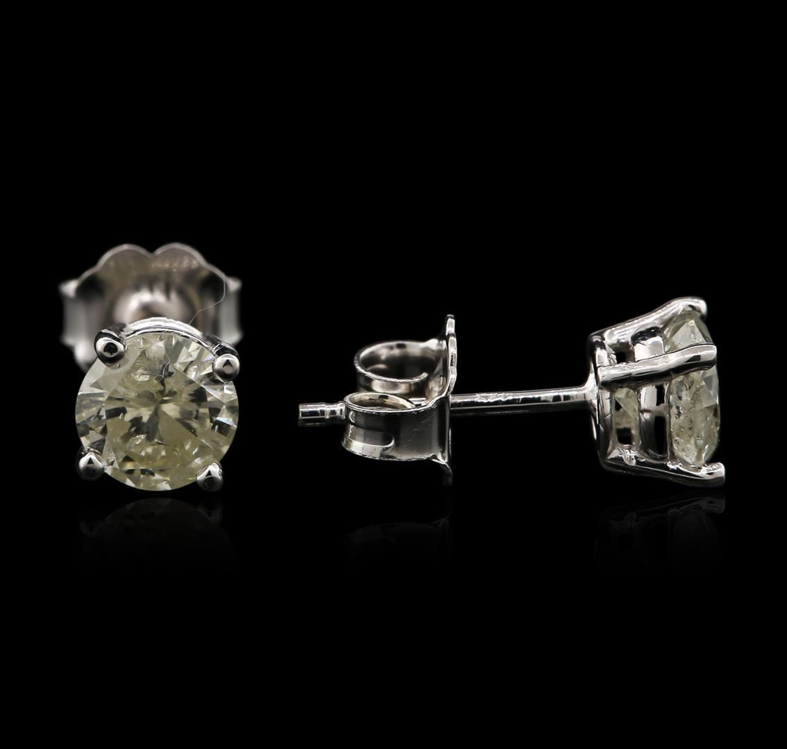 One pair electronically tested 14KT white gold ladies cast diamond stud earrings with friction posts with a bright polish finish. Identified with markings of "14K". Condition is new. Containing: Two prong set round brilliant cut diamonds, measuring 5.40 - 5.40 x 3.26mm (depth est.) approximate total weight of 2 Stones = 1.16ct. Clarity: I-3 to I-3. Color: K, Cut is Good. Diamonds are graded in the mounting, unless otherwise stated. Total Weight of Diamonds 1.16ct. Total Weight of Stud Earrings 1.10 grams. GGL Appraised at $1,595.00.
