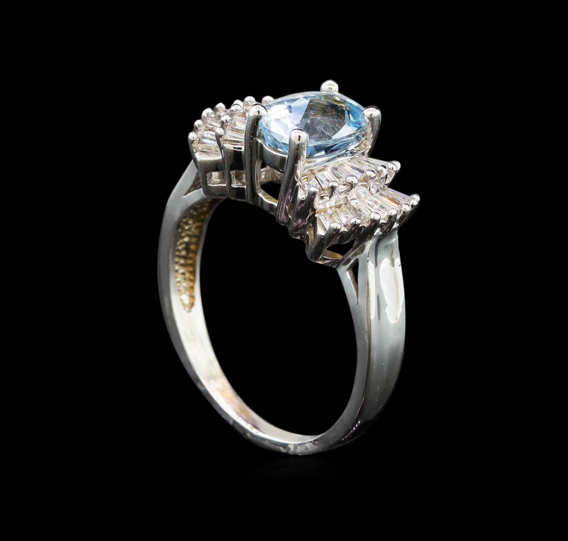 One electronically tested 14KT white gold ladies cast aquamarine and diamond ring with a bright polish finish. The featured aquamarine is supported by diamond set shoulders, completed by a one and one-half millimeter wide band. Identified with markings of "14K". Condition is new, good workmanship. Containing: One prong set oval mixed cut natural aquamarine, measuring 8.00 x 5.60 x 4.40mm, 6% bulge factor, approximate weight of 1.17ct., clarity is eye clean, type I, medium, very slightly grayish, very slightly greenish blue color, (GIA vslgB 5/3), cut is good. Transmitting light with no distortion, transparent. Graded in the setting. Twenty-Eight prong set baguette cut (tapered) diamonds, measuring from 2.00 x 1.10 x 0.77mm (depth est.) to 2.40 x 1.20 x 0.84mm (depth est.) approximate total weight of 28 Stones = 0.52ct. Graded in the setting. Clarity: SI-1 to I-1. Color: G - I. Total Weight of Colored Stones 1.17ct. Total Weight of Diamonds 0.52ct. Total Weight of Ring 4.25 grams. AIG Appraised at $2,610.00.