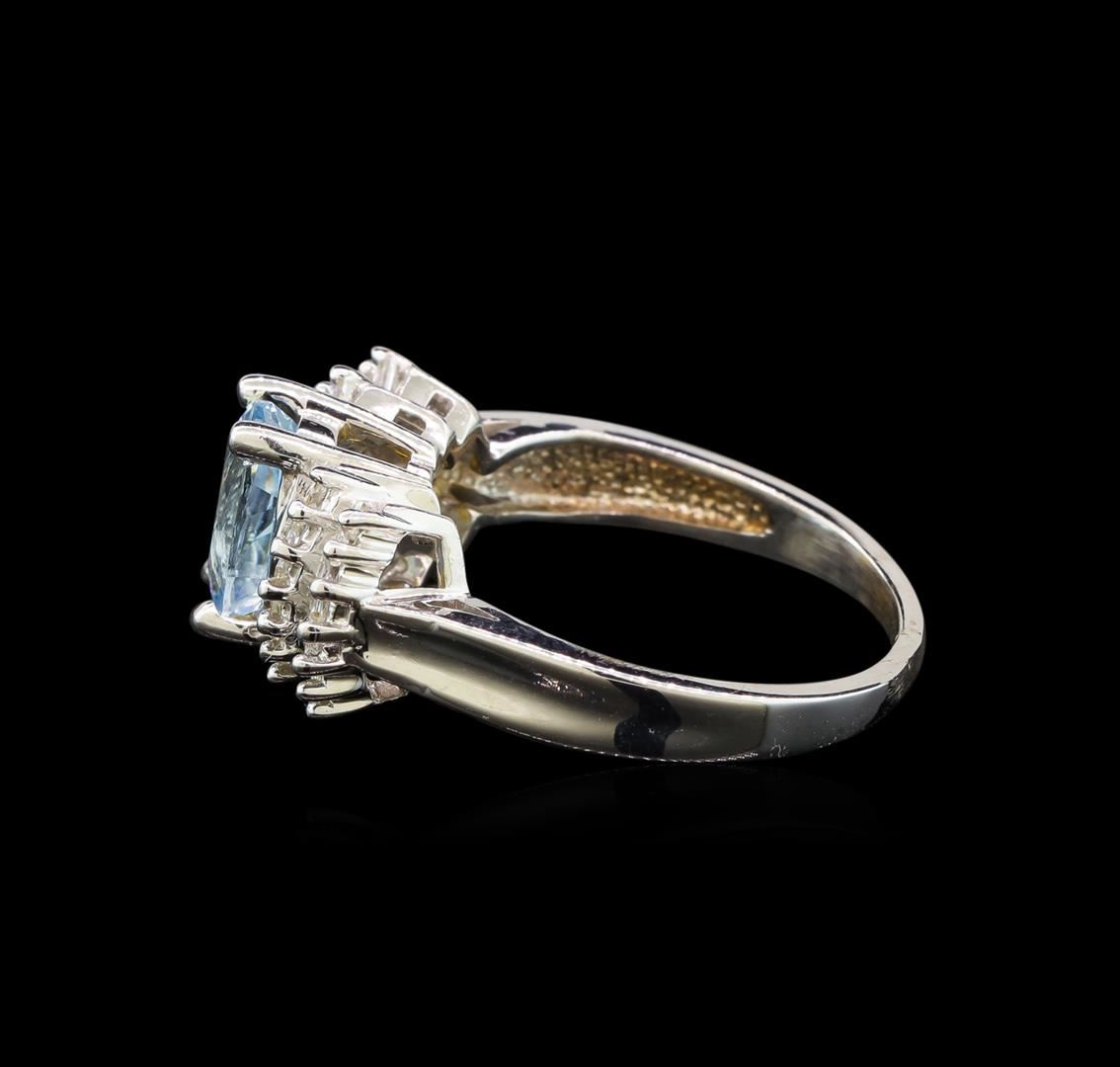 One electronically tested 14KT white gold ladies cast aquamarine and diamond ring with a bright polish finish. The featured aquamarine is supported by diamond set shoulders, completed by a one and one-half millimeter wide band. Identified with markings of "14K". Condition is new, good workmanship. Containing: One prong set oval mixed cut natural aquamarine, measuring 8.00 x 5.60 x 4.40mm, 6% bulge factor, approximate weight of 1.17ct., clarity is eye clean, type I, medium, very slightly grayish, very slightly greenish blue color, (GIA vslgB 5/3), cut is good. Transmitting light with no distortion, transparent. Graded in the setting. Twenty-Eight prong set baguette cut (tapered) diamonds, measuring from 2.00 x 1.10 x 0.77mm (depth est.) to 2.40 x 1.20 x 0.84mm (depth est.) approximate total weight of 28 Stones = 0.52ct. Graded in the setting. Clarity: SI-1 to I-1. Color: G - I. Total Weight of Colored Stones 1.17ct. Total Weight of Diamonds 0.52ct. Total Weight of Ring 4.25 grams. AIG Appraised at $2,610.00.