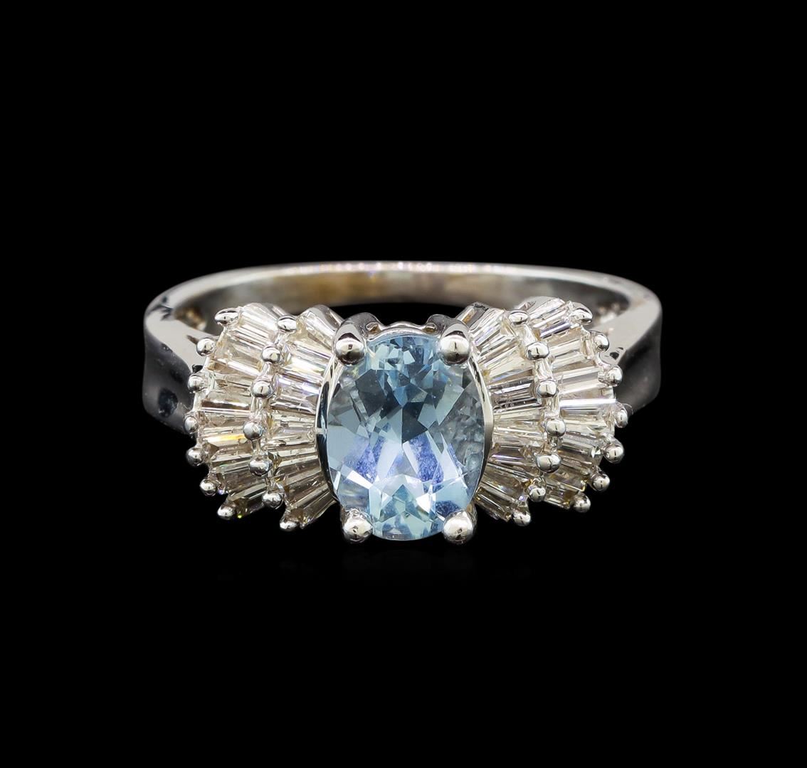 One electronically tested 14KT white gold ladies cast aquamarine and diamond ring with a bright polish finish. The featured aquamarine is supported by diamond set shoulders, completed by a one and one-half millimeter wide band. Identified with markings of "14K". Condition is new, good workmanship. Containing: One prong set oval mixed cut natural aquamarine, measuring 8.00 x 5.60 x 4.40mm, 6% bulge factor, approximate weight of 1.17ct., clarity is eye clean, type I, medium, very slightly grayish, very slightly greenish blue color, (GIA vslgB 5/3), cut is good. Transmitting light with no distortion, transparent. Graded in the setting. Twenty-Eight prong set baguette cut (tapered) diamonds, measuring from 2.00 x 1.10 x 0.77mm (depth est.) to 2.40 x 1.20 x 0.84mm (depth est.) approximate total weight of 28 Stones = 0.52ct. Graded in the setting. Clarity: SI-1 to I-1. Color: G - I. Total Weight of Colored Stones 1.17ct. Total Weight of Diamonds 0.52ct. Total Weight of Ring 4.25 grams. AIG Appraised at $2,610.00.