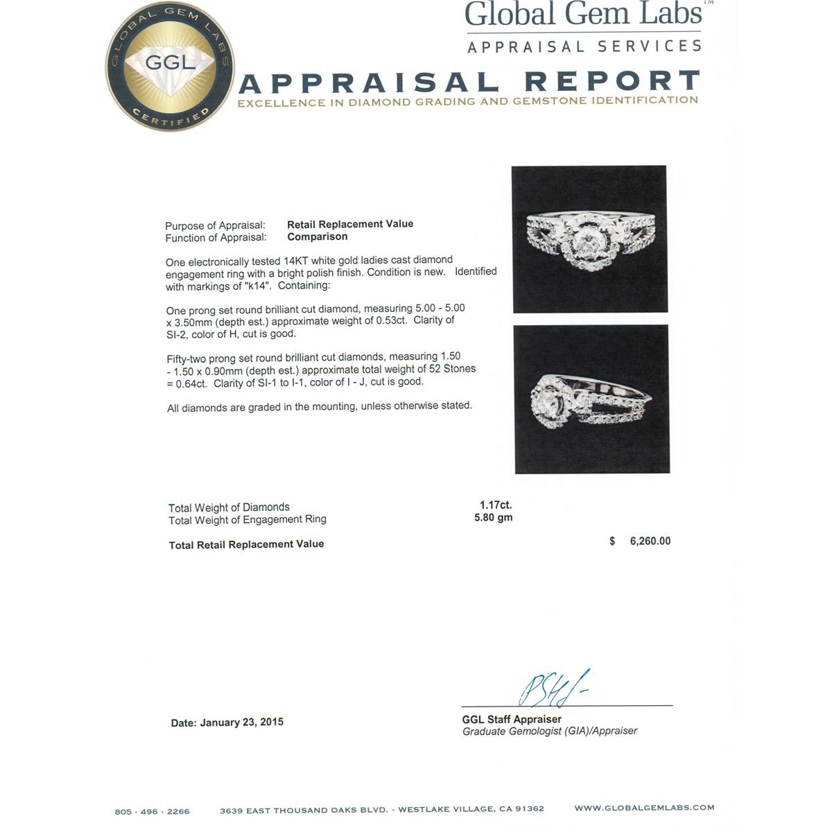 One electronically tested 14KT white gold ladies cast diamond engagement ring with a bright polish finish. Identified with markings of "k14". Condition is new. Containing: One prong set round brilliant cut diamond, measuring 5.00 - 5.00 x 3.50mm (depth est.) approximate weight of 0.53ct. Clarity: SI-2. Color: H, Cut is Good. Fifty-Two prong set round brilliant cut diamonds, measuring 1.50 - 1.50 x 0.90mm (depth est.) approximate total weight of 52 Stones = 0.64ct. Clarity: SI-1 to I-1. Color: I - J, Cut is Good. All diamonds are graded in the mounting, unless otherwise stated. Total Weight of Diamonds 1.17ct. Total Weight of Engagement Ring 5.80 grams. GGL Appraised at $6,260.00.