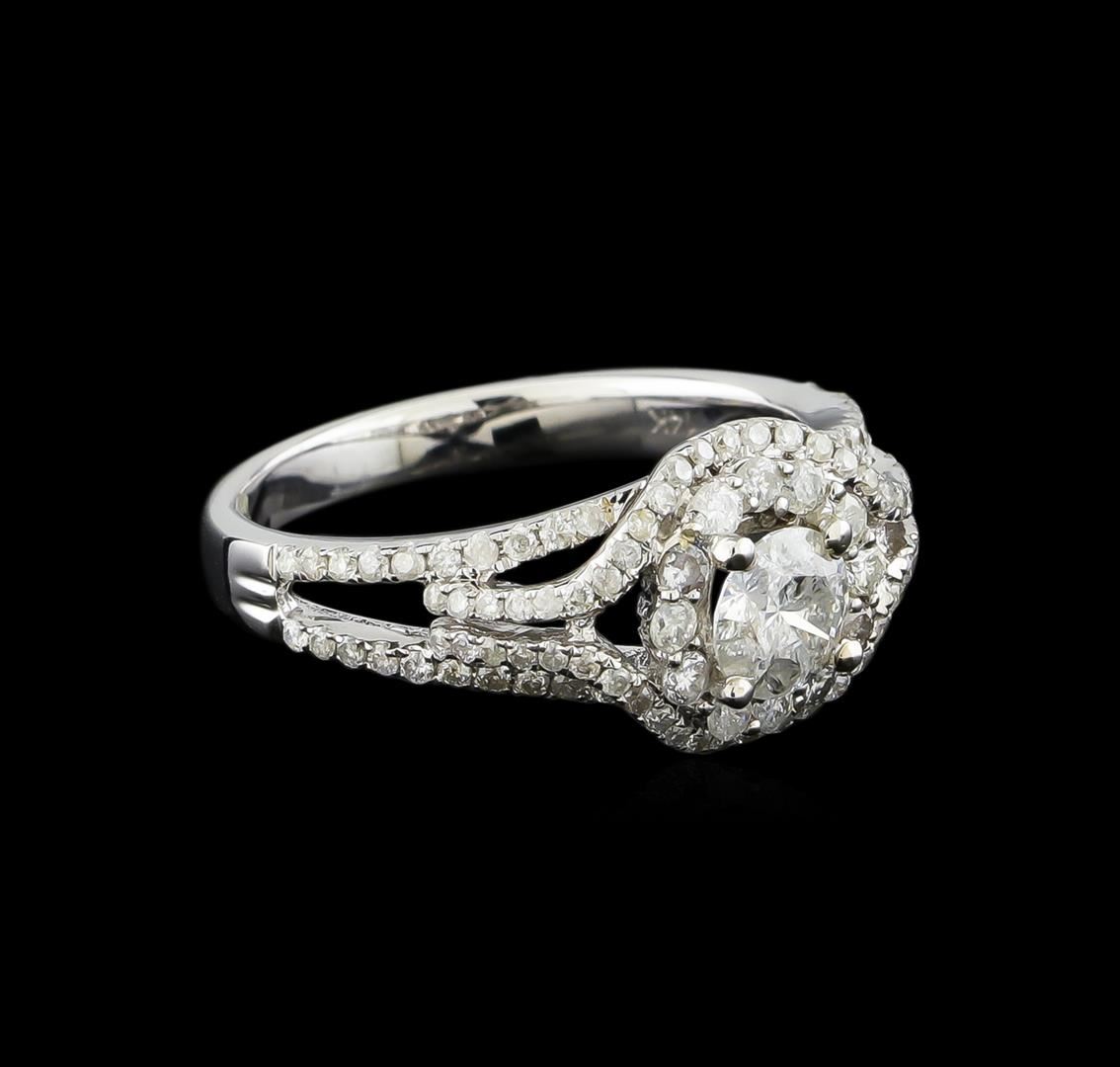 One electronically tested 14KT white gold ladies combination cast & assembled engagement ring with a split shank with a bright polish finish. Identified with markings of "14K". Condition is new. Containing: One prong set round brilliant cut diamond, measuring 5.40 - 5.37 x 3.24mm (depth est.) approximate weight of 0.57ct. Clarity: I-3. Color: J, Cut is Good. One Hundred prong set round brilliant cut diamonds, measuring 1.50 - 1.00 x 0.75mm (depth est.) approximate total weight of 100 Stones = 0.60ct. Clarity: I-1 to I-2. Color: I - J, Cut is Good. All diamonds are graded in the mounting, unless otherwise stated. Total Weight of Diamonds 1.17ct. Total Weight of Ring 4.10 grams. GGL Appraised at $4,025.00.