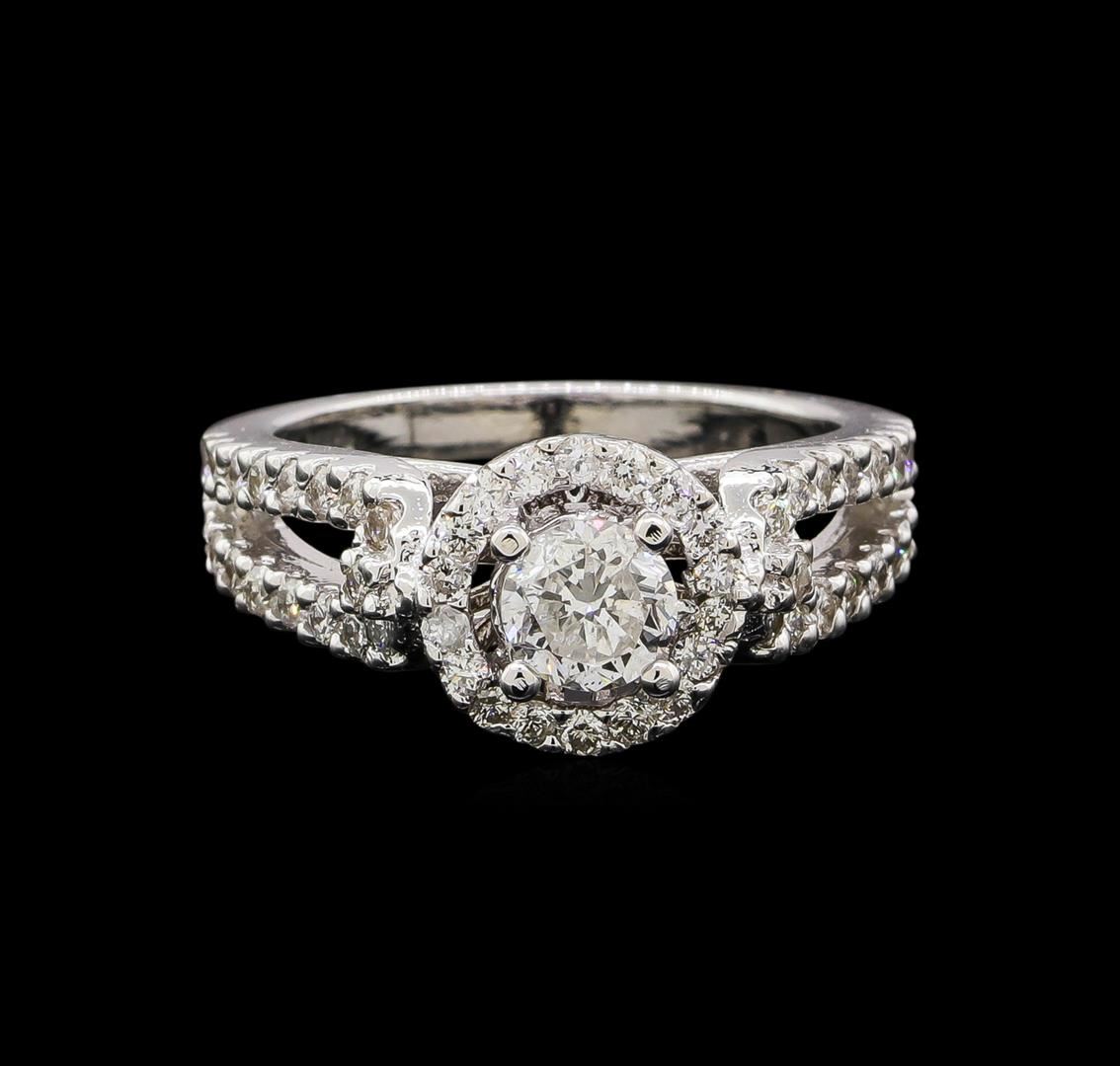One electronically tested 14KT white gold ladies cast diamond engagement ring with a bright polish finish. Identified with markings of "k14". Condition is new. Containing: One prong set round brilliant cut diamond, measuring 5.00 - 5.00 x 3.50mm (depth est.) approximate weight of 0.53ct. Clarity: SI-2. Color: H, Cut is Good. Fifty-Two prong set round brilliant cut diamonds, measuring 1.50 - 1.50 x 0.90mm (depth est.) approximate total weight of 52 Stones = 0.64ct. Clarity: SI-1 to I-1. Color: I - J, Cut is Good. All diamonds are graded in the mounting, unless otherwise stated. Total Weight of Diamonds 1.17ct. Total Weight of Engagement Ring 5.80 grams. GGL Appraised at $6,260.00.