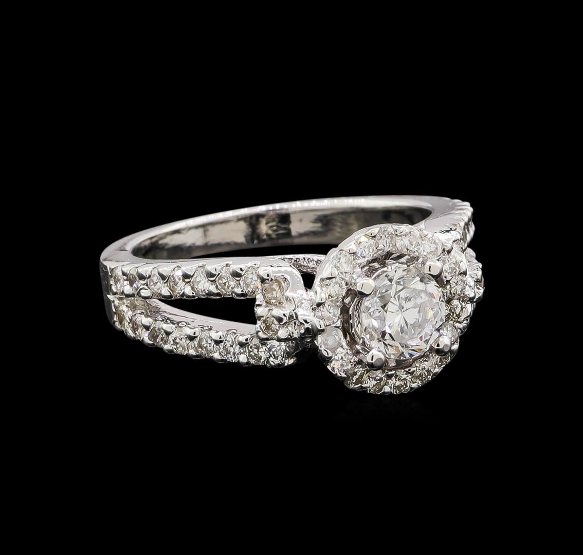 One electronically tested 14KT white gold ladies cast diamond engagement ring with a bright polish finish. Identified with markings of "k14". Condition is new. Containing: One prong set round brilliant cut diamond, measuring 5.00 - 5.00 x 3.50mm (depth est.) approximate weight of 0.53ct. Clarity: SI-2. Color: H, Cut is Good. Fifty-Two prong set round brilliant cut diamonds, measuring 1.50 - 1.50 x 0.90mm (depth est.) approximate total weight of 52 Stones = 0.64ct. Clarity: SI-1 to I-1. Color: I - J, Cut is Good. All diamonds are graded in the mounting, unless otherwise stated. Total Weight of Diamonds 1.17ct. Total Weight of Engagement Ring 5.80 grams. GGL Appraised at $6,260.00.