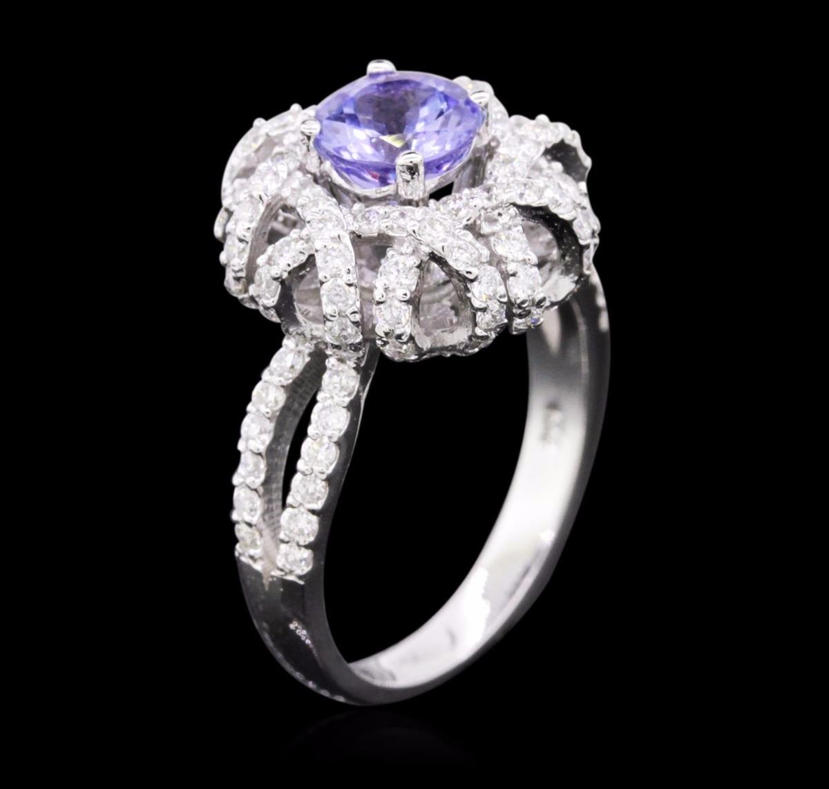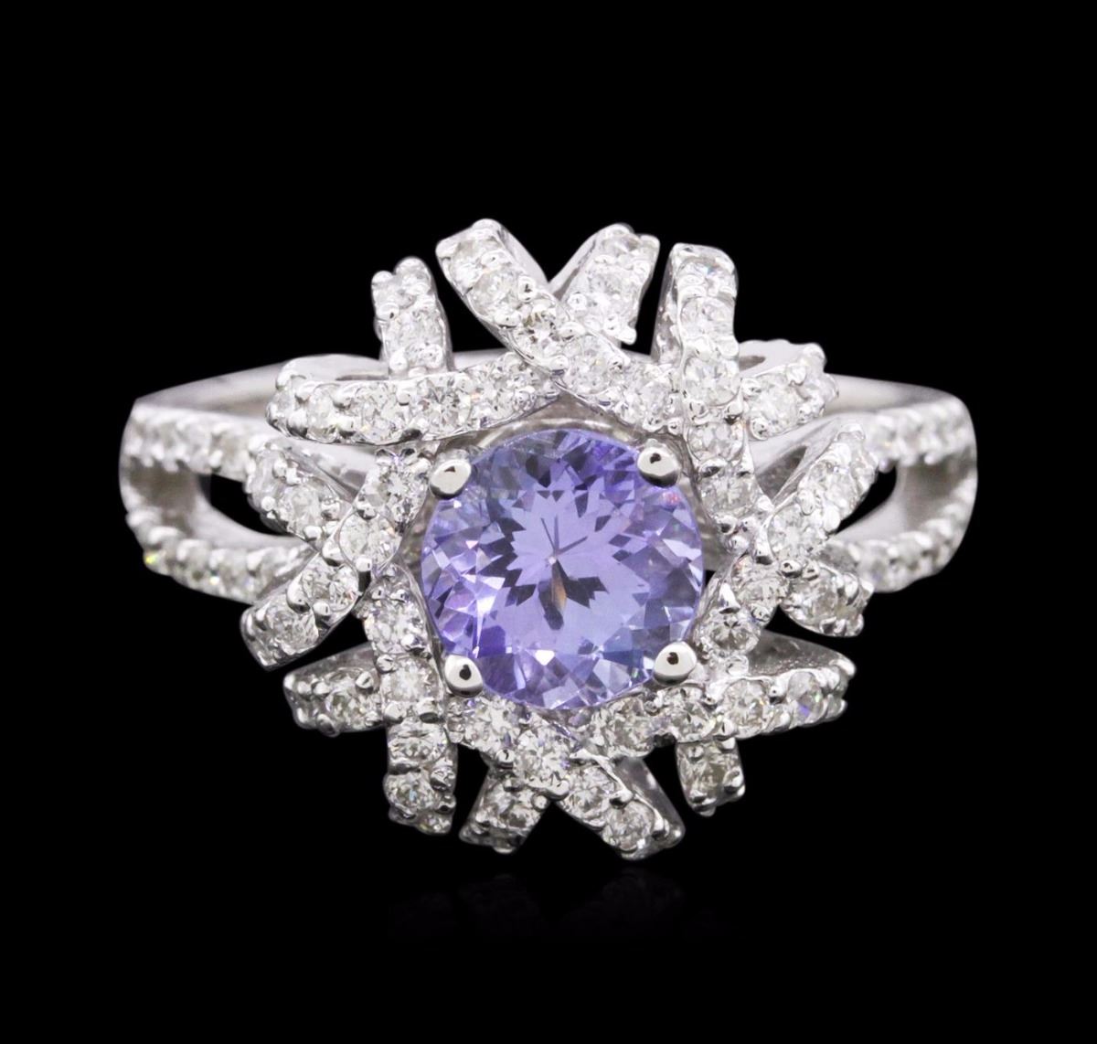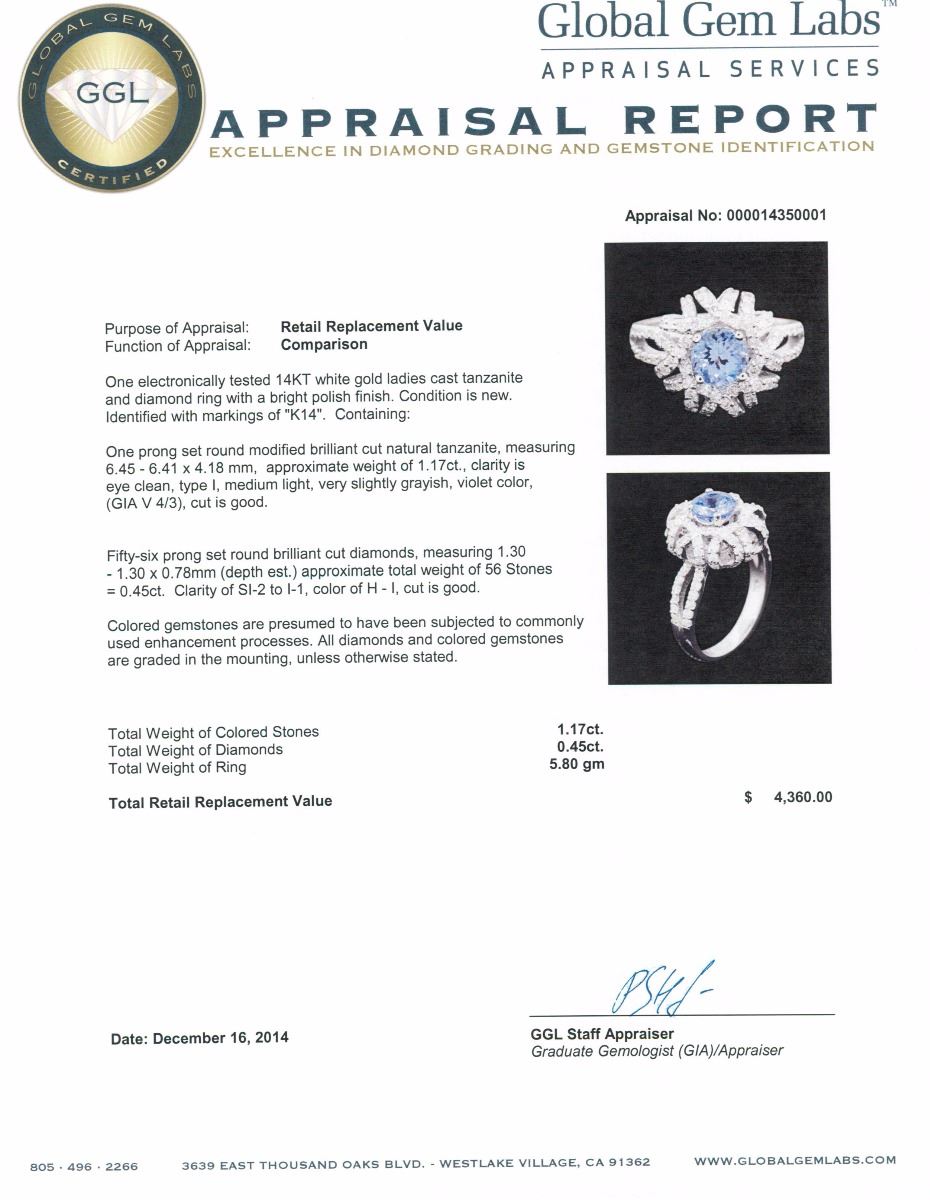 One electronically tested 14KT white gold ladies cast tanzanite and diamond ring with a bright polish finish. Identified with markings of "K14". Condition is new. Containing: One prong set round modified brilliant cut natural tanzanite, measuring 6.45 - 6.41 x 4.18 mm, approximate weight of 1.17ct., clarity is eye clean, type I, medium light, very slightly grayish, violet color, (GIA V 4/3), cut is good. Fifty-Six prong set round brilliant cut diamonds, measuring 1.30 - 1.30 x 0.78mm (depth est.) approximate total weight of 56 Stones = 0.45ct. Clarity: SI-2 to I-1. Color: H - I, Cut is Good. Colored gemstones are presumed to have been subjected to commonly used enhancement processes. All diamonds and colored gemstones are graded in the mounting, unless otherwise stated. Total Weight of Colored Stones 1.17ct. Total Weight of Diamonds 0.45ct. Total Weight of Ring 5.80 grams. GGL Appraised at $4,360.00.